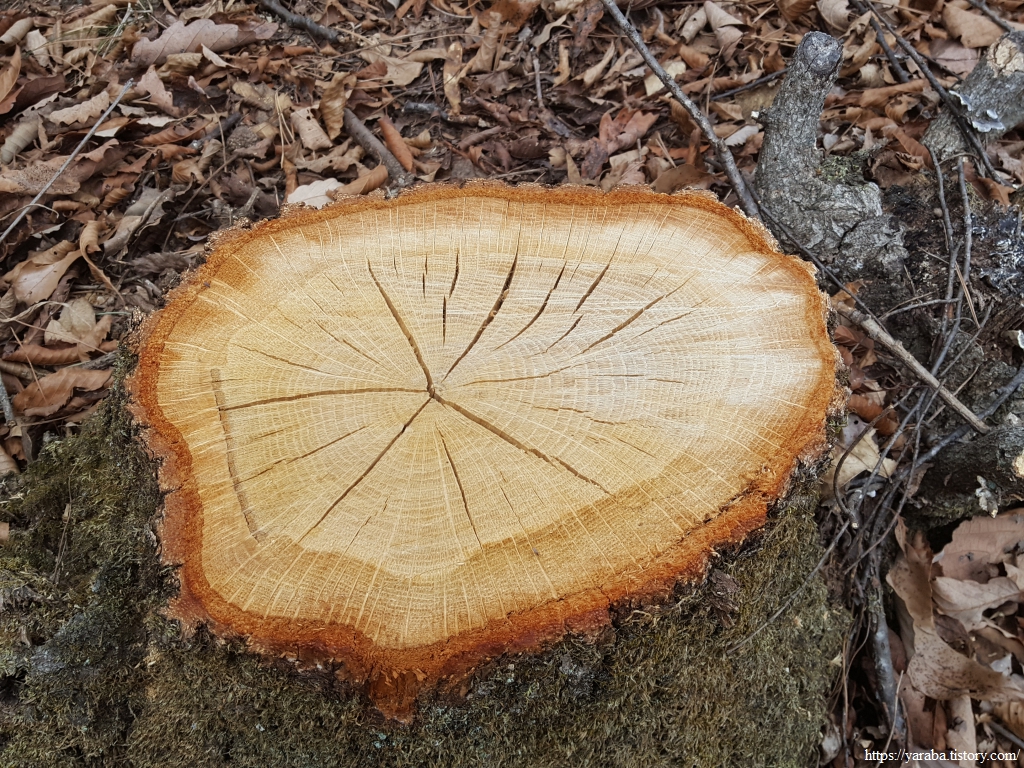 수십 년을 이곳에서 살아왔을 나무들의 나이테를 보니 신기하기도 하고 인생무상의 감정도 슬그머니 들어온다. 같은 지역에 살아도 나무 종류마다 다른 나무의 단면도 신기하다. 참나무에게 있는 코르크 층은 더욱 눈길이 간다.