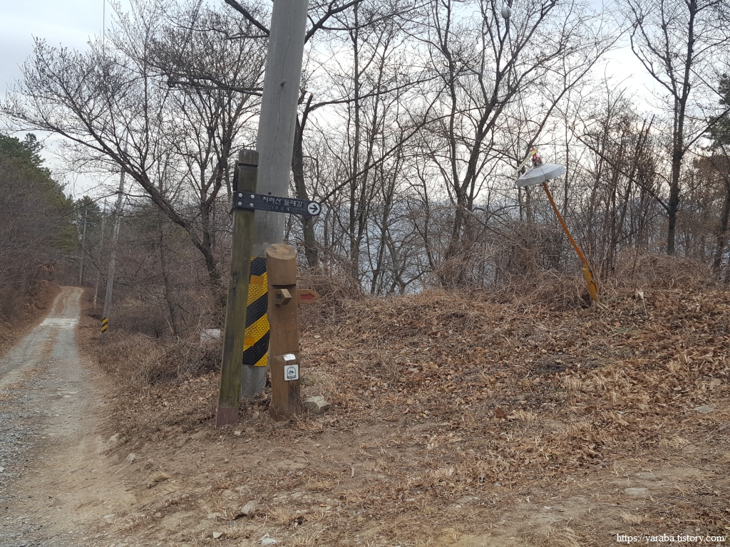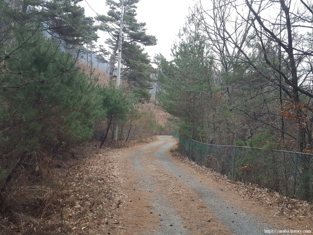 방곡마을 이후로는 도로를 벗어나 저수지 상류의 오봉 계곡에서 내려오는 골짜기를 가로질러 임도를 통해 왕산 계곡으로 향한다.