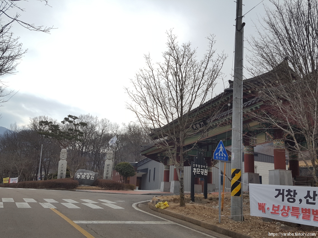 오봉천을 따라 올라가는 계곡 입구에는 점촌마을, 방곡마을 표지, 다양한 사찰들의 이름, 오봉계곡과 더불어 산청, 함양 사건 추모공원이라는 안내판이 세워져 있다.