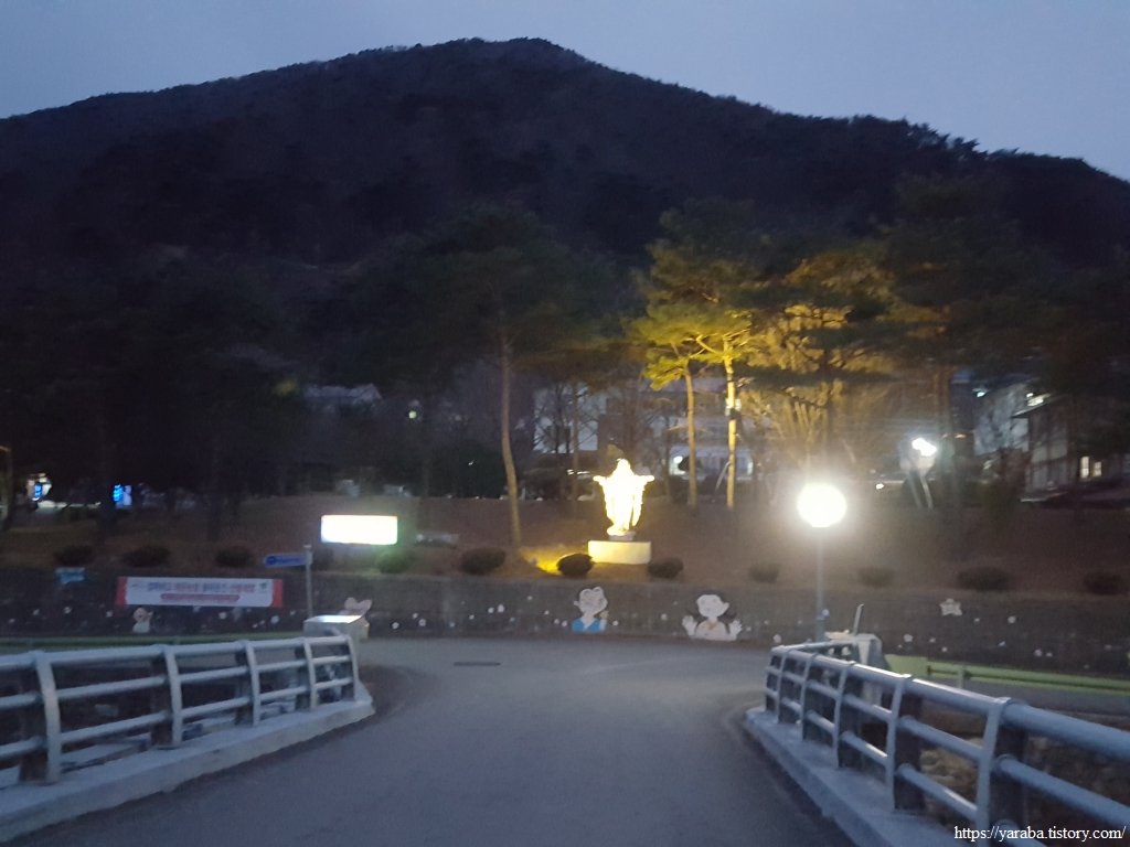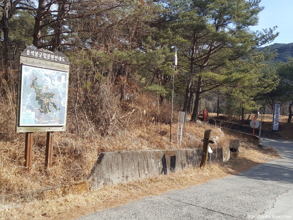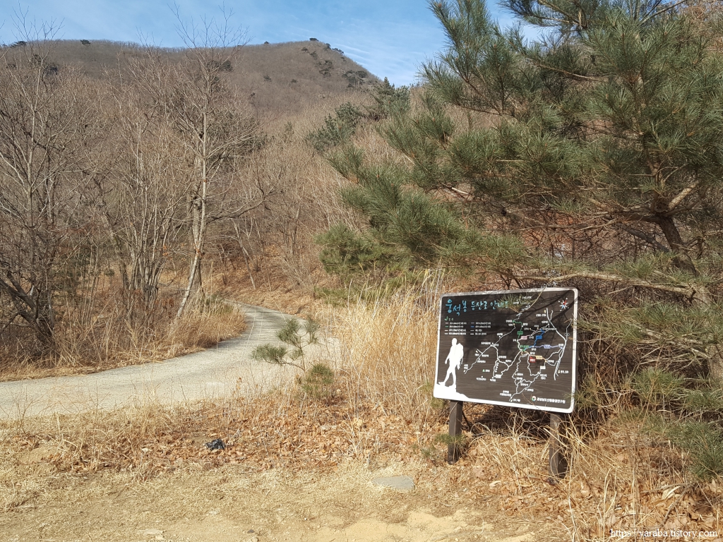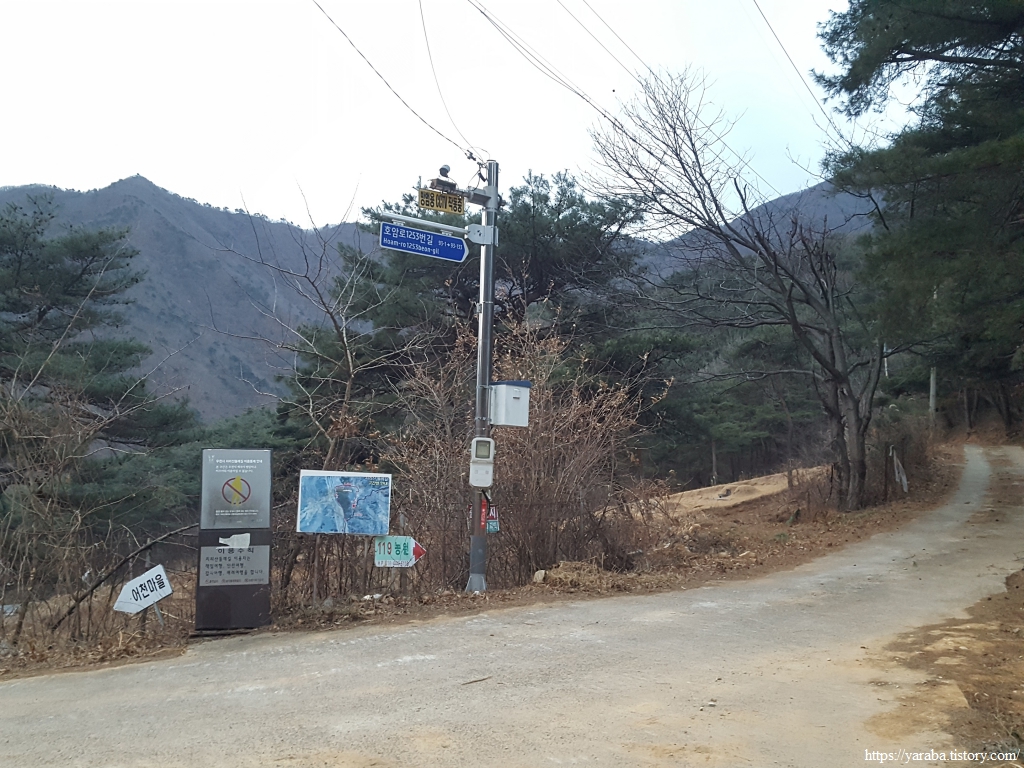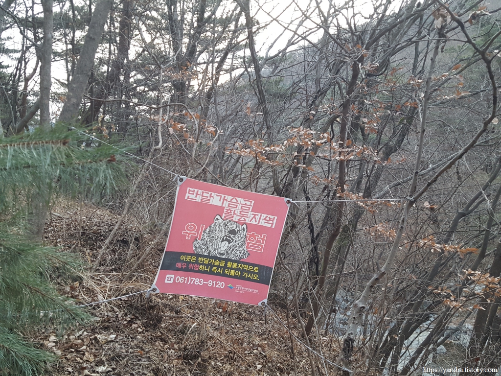 반달가슴곰이 활동하는 지역이라는 경고판에 그린 곰의 모습이 무섭다. 즉시 돌아가라는 경고 문구도 섬뜩하다. 다행히 곰돌이들이 겨울잠 자고 있는 계절이라는 것에 안심하며 계곡물을 건너서 본격적으로 오르막길을 오른다.