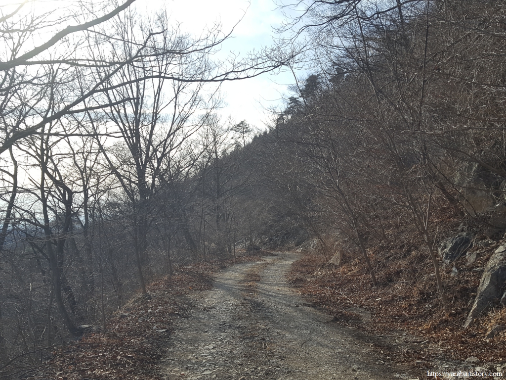 웅석봉으로 가는 길이 있지만 둘레길은 아침재 고개 이후로 얼마간 산 허리로 이어지는 임도를 걷는다.