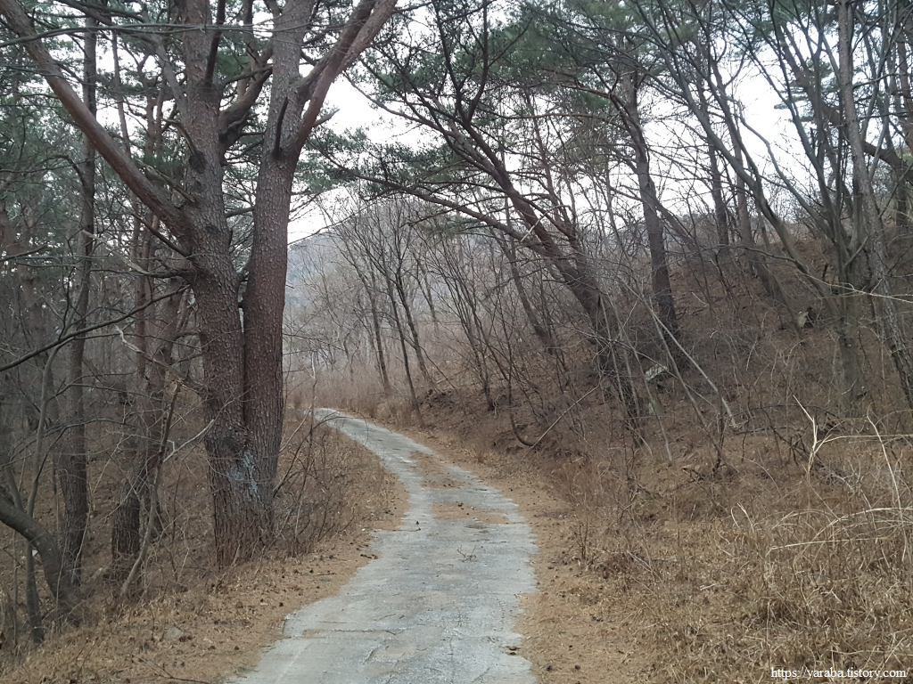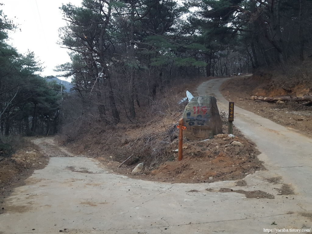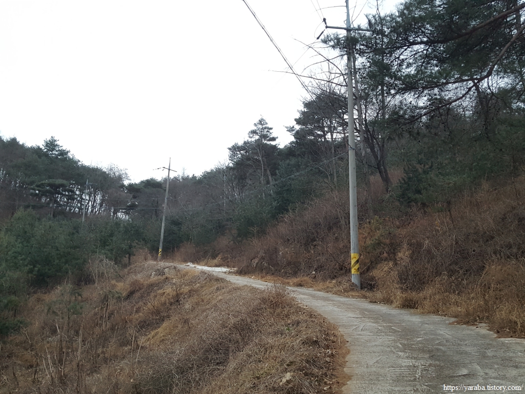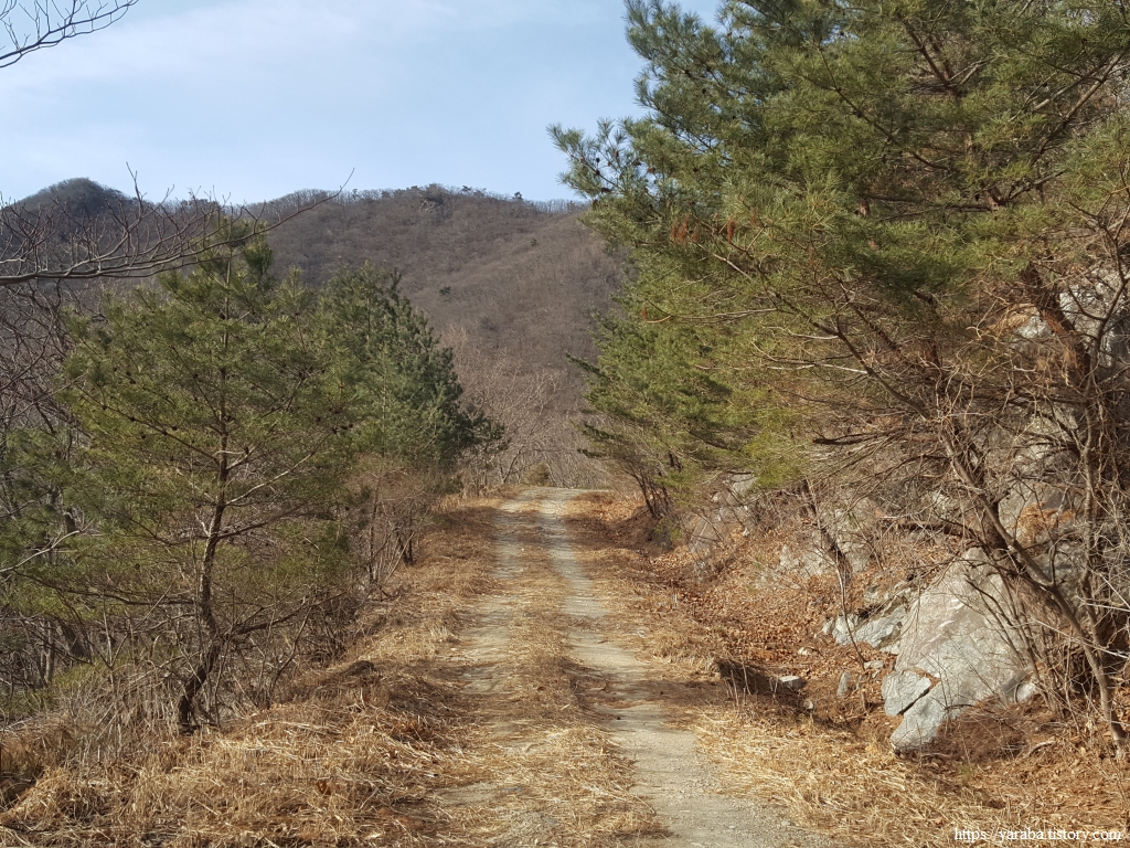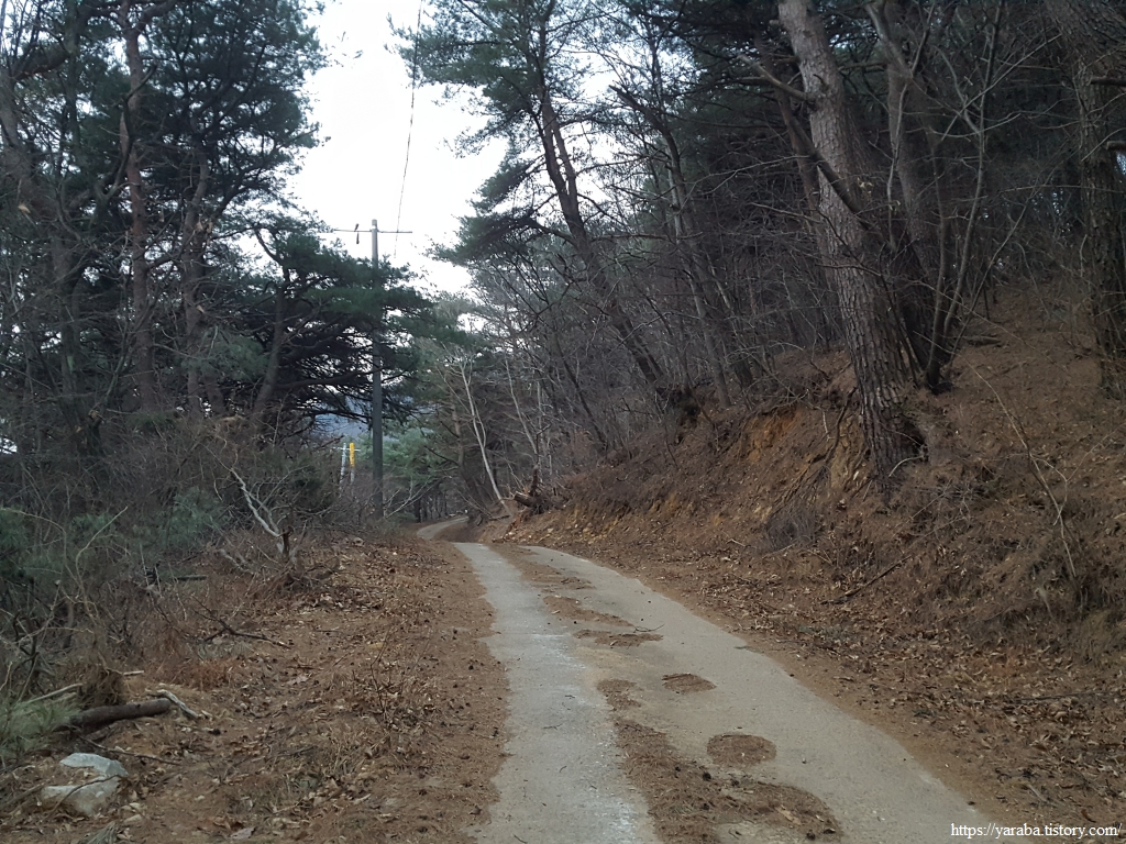 아침재 고개에 올라서면 어천마을로 내려가는 갈림길이 나오는데 둘레길은 우측 임도를 통해서 길을 이어간다.