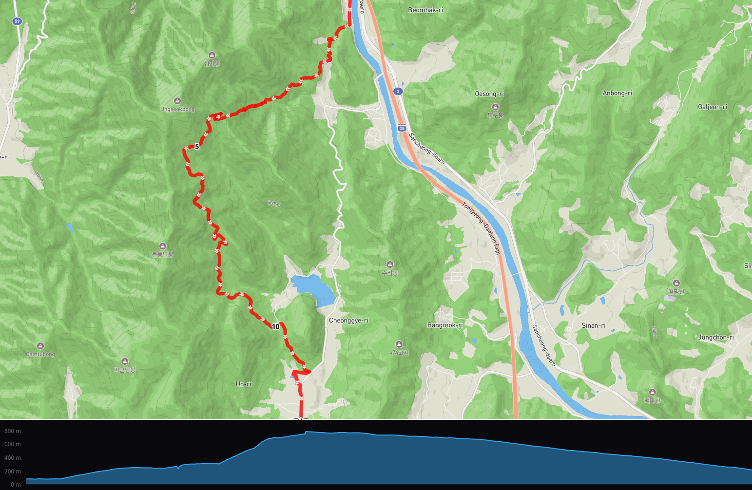 도로를 따라 내려온 둘레길을 운리마을 회관 앞에서 마무리하고 청계마을에서 내려오는 버스를 타고 원지 버스 정류장으로 나가서 고속버스를 타고 집으로 돌아간다. 원지 정류장은 나름 길목이라 대도시로 가는 버스들이 많았다.