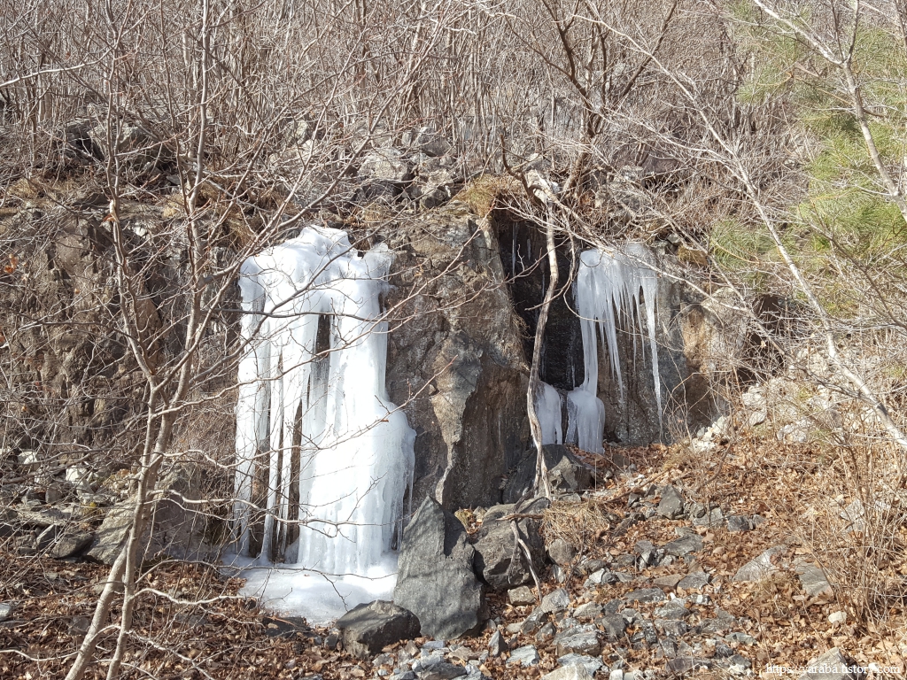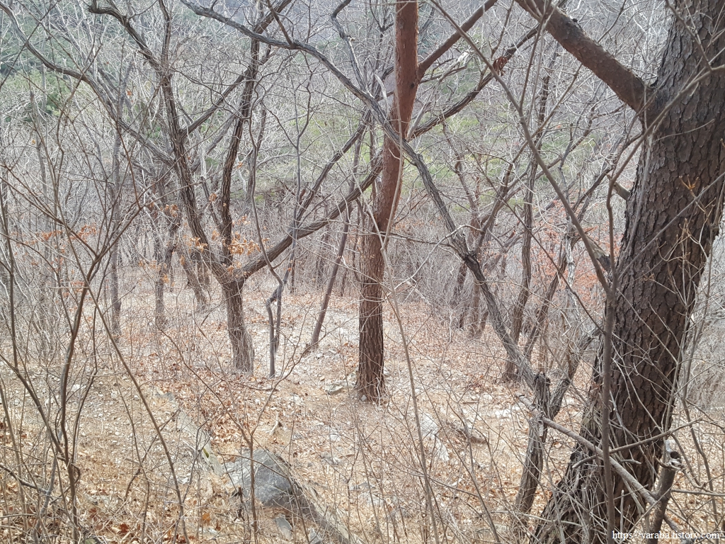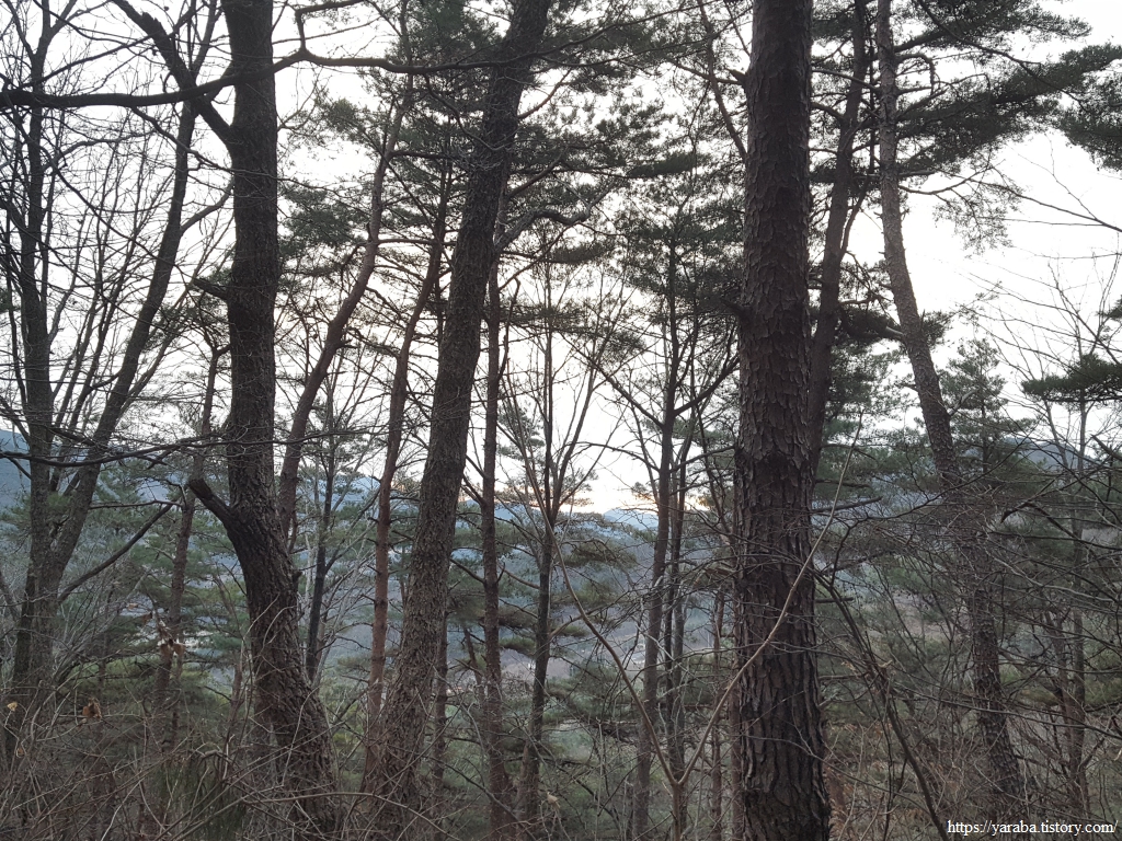 가볍게 임도를 걸으며 나무 사이 시야로 들어오는 풍경이 무엇일까? 상상해 본다. 호수 같은 것이 보이는 것으로 보아 아마도 남쪽에 위치한 진양호 물줄기가 아닌가 싶기도 하다. 진양호의 진양은 진주의 옛 이름이라고 한다. 임도 한쪽으로는 햇살이 들어오는 양달인데도 얼음이 얼어 있다. 지금 날씨가 어떤지를 보여준다.