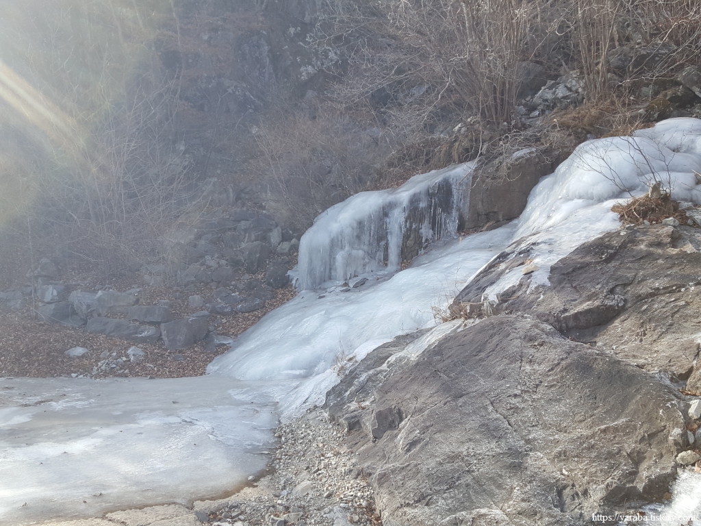계곡물이 임도로 흘러넘치며 얼어버린 구간에서는 왠지 불안한 느낌도 있었지만 깊이가 있을 리 만무하고 꽁꽁 얼은 상태였기 때문에 별 문제가 없었지만 옆지기는 넓지 않은 빙판 구간이 상당히 불안한 모양인지 엉금엉금이다.ㅎㅎ
