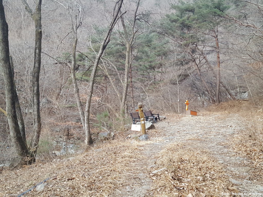 숲 사이로 아침 태양이 조금씩 보일 무렵, 임도를 걷던 둘레길은 끝나고 이제 본격적으로 등산로 오르막을 오를 채비를 갖춘다. 숲길 입구에 친절하게도 벤치를 놓아두셨다. 잠시 숨을 고르고 본격적으로 이어질 오르막 숲길을 준비한다. 약 2Km가 넘는 오르막 숲이 계속 이어진다.