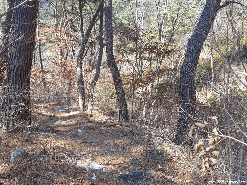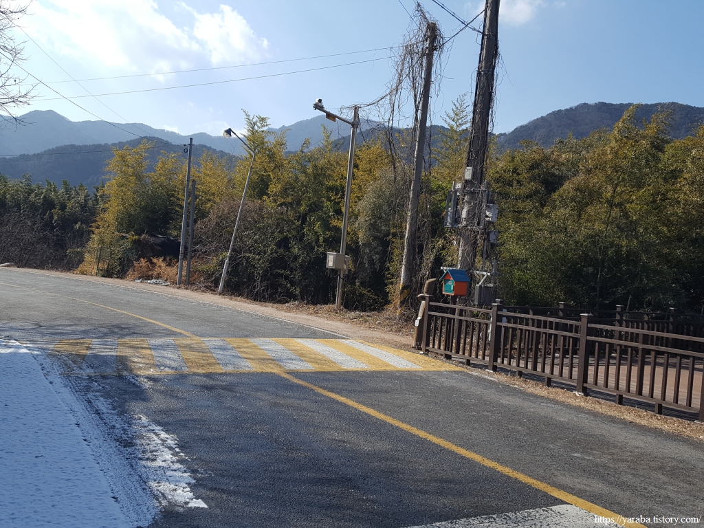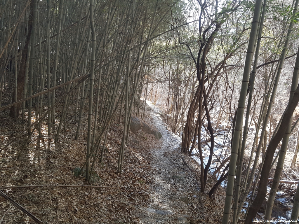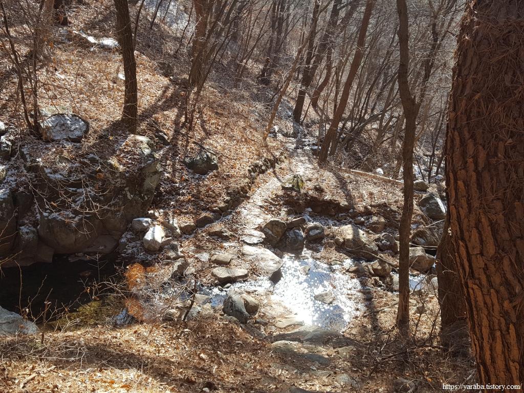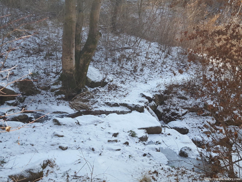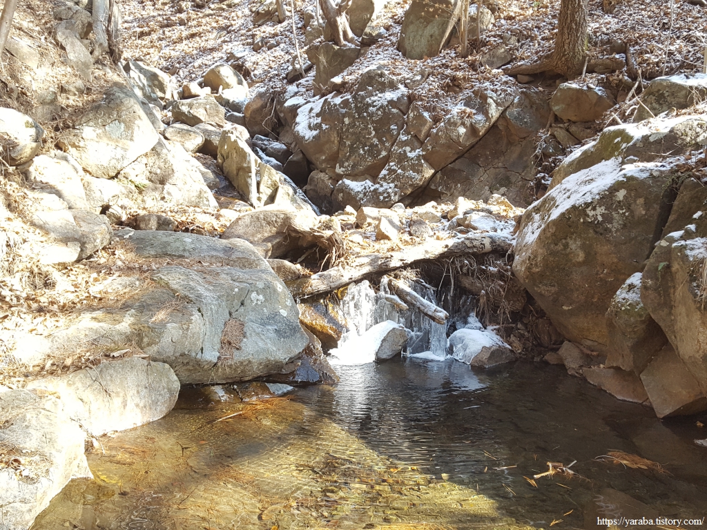 이 겨울에도 물이 흘러내려가는 계곡을 보니 비가 조금 많이 내리는 경우에는 계곡을 건너가는 것이 만만치 않아 보인다. 비가 내리면 우회로를 이용하는 것이 좋은 선택이겠구나 하는 생각이 들었다. 맑은 계곡물을 보니 "깊은 산속 옹달샘....." 하는 동요가 흥얼거려진다.