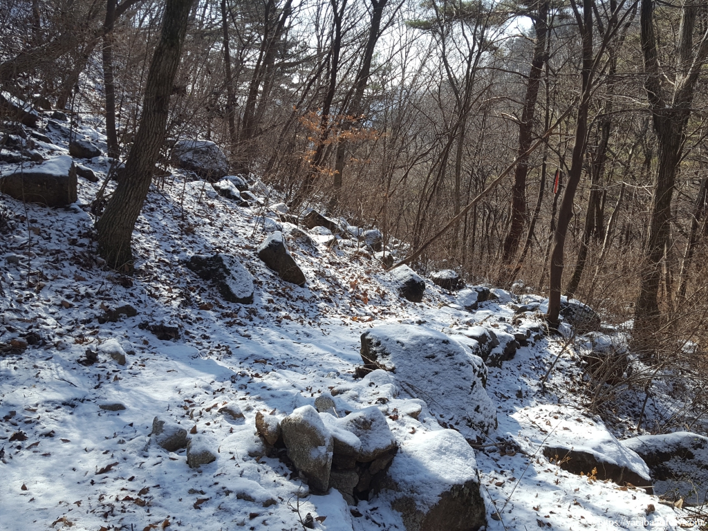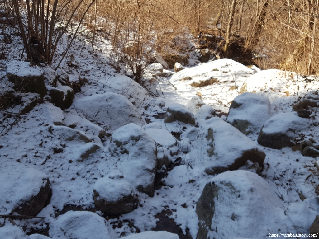 계곡에 물이 많은 것은 아니지만 눈이 덮여 있어서 걸음걸음 조심스럽다.