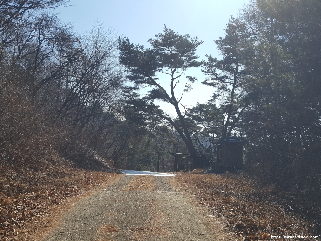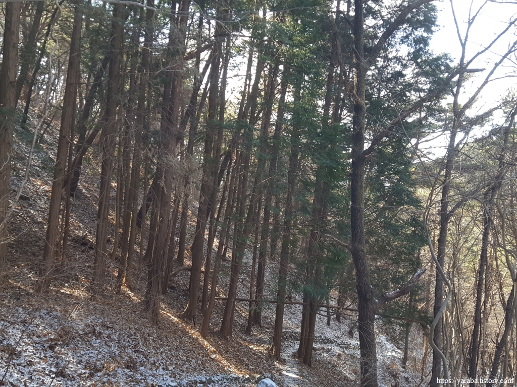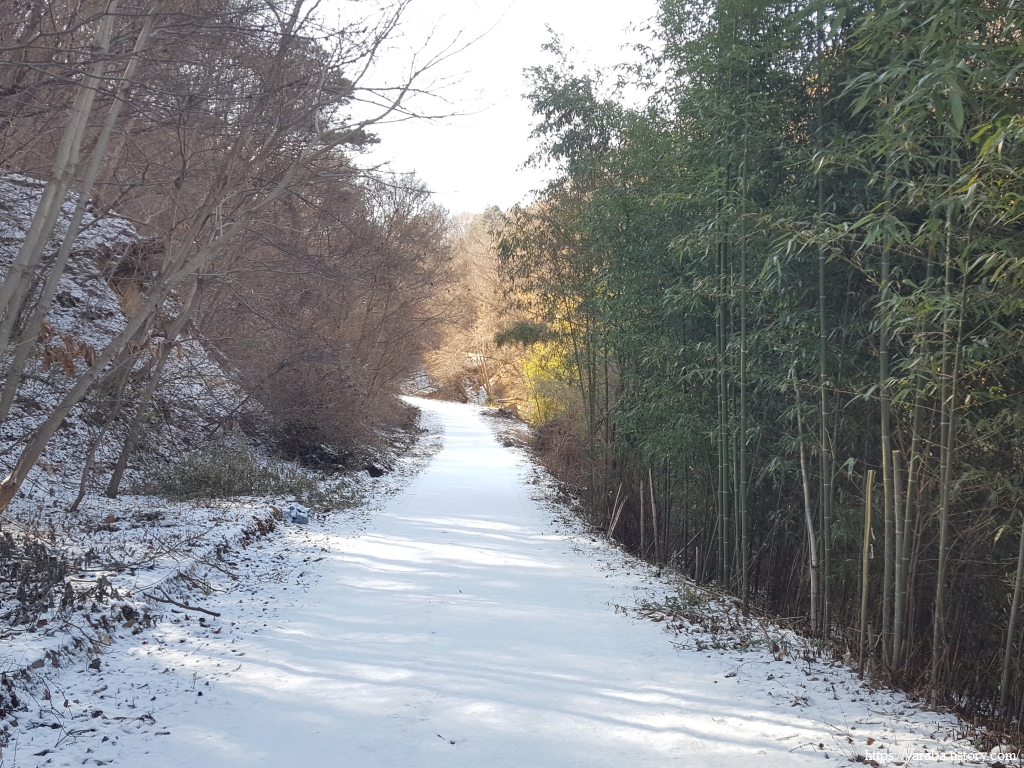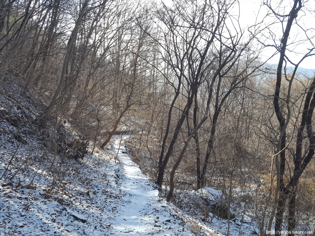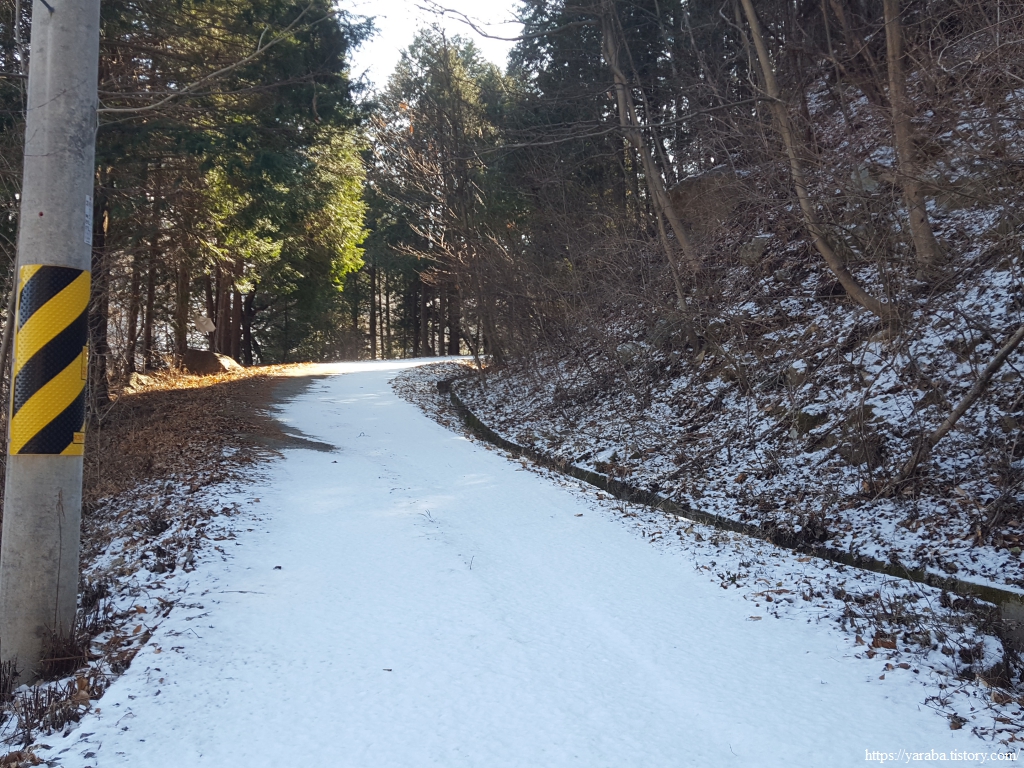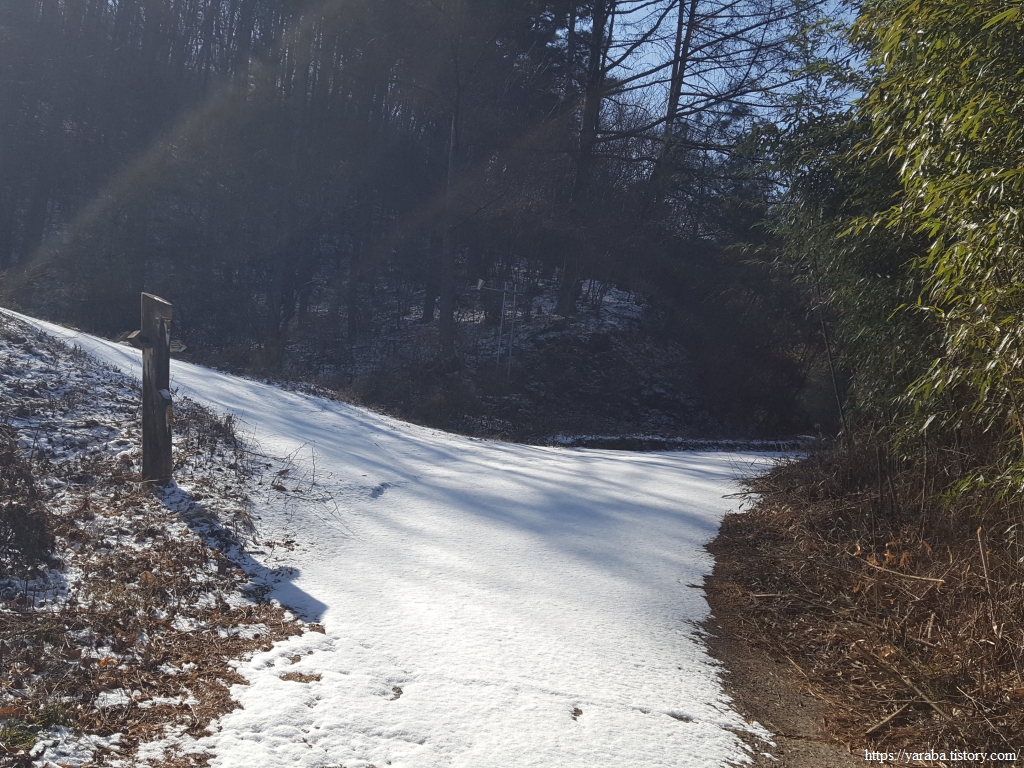 두껍게 깔린 눈은 아니지만 눈길을 지나서 드디어 양이터재 고개에 이른다.