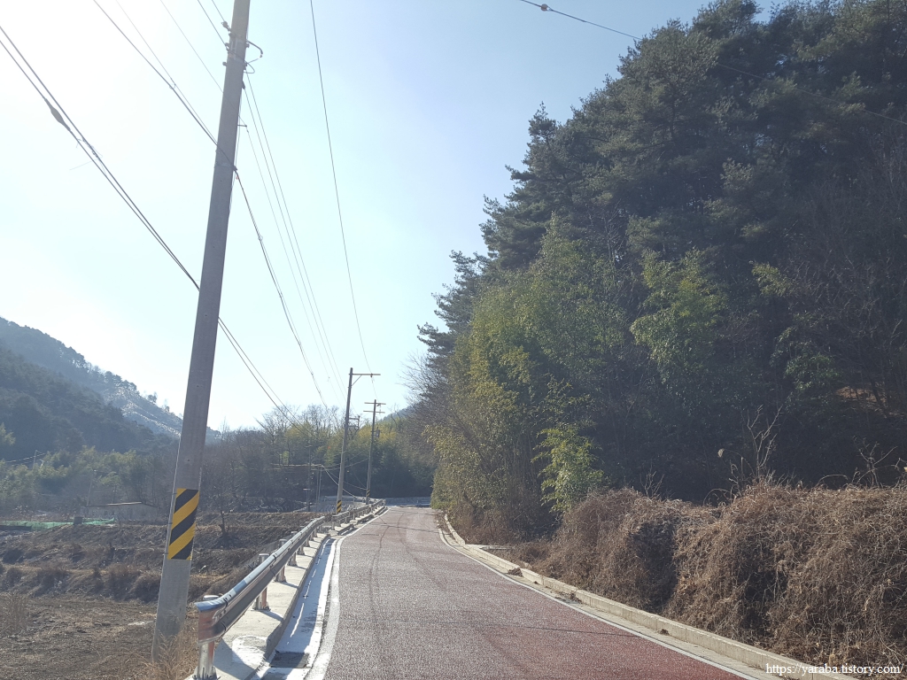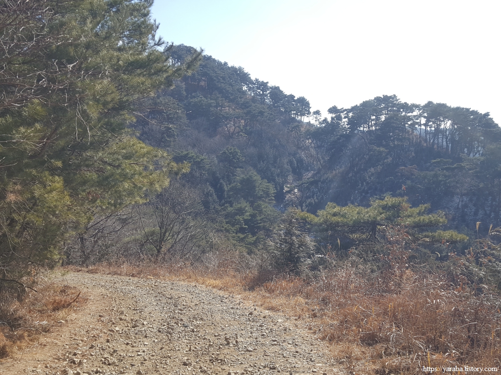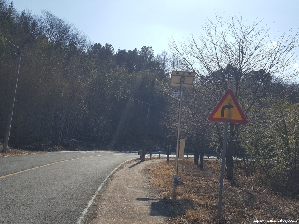 고도 약 3백 미터인 궁항 마을에서 고도 530미터의 양이터재 고개까지 약 2.5 Km의 오르막길은 몸에 열을 올리기는 하지만 완만한 오르막의 포장길이라 걷기에 좋은 길이다. 이제 민간도 끝이 나고 고개가 얼마 남지 않았다.