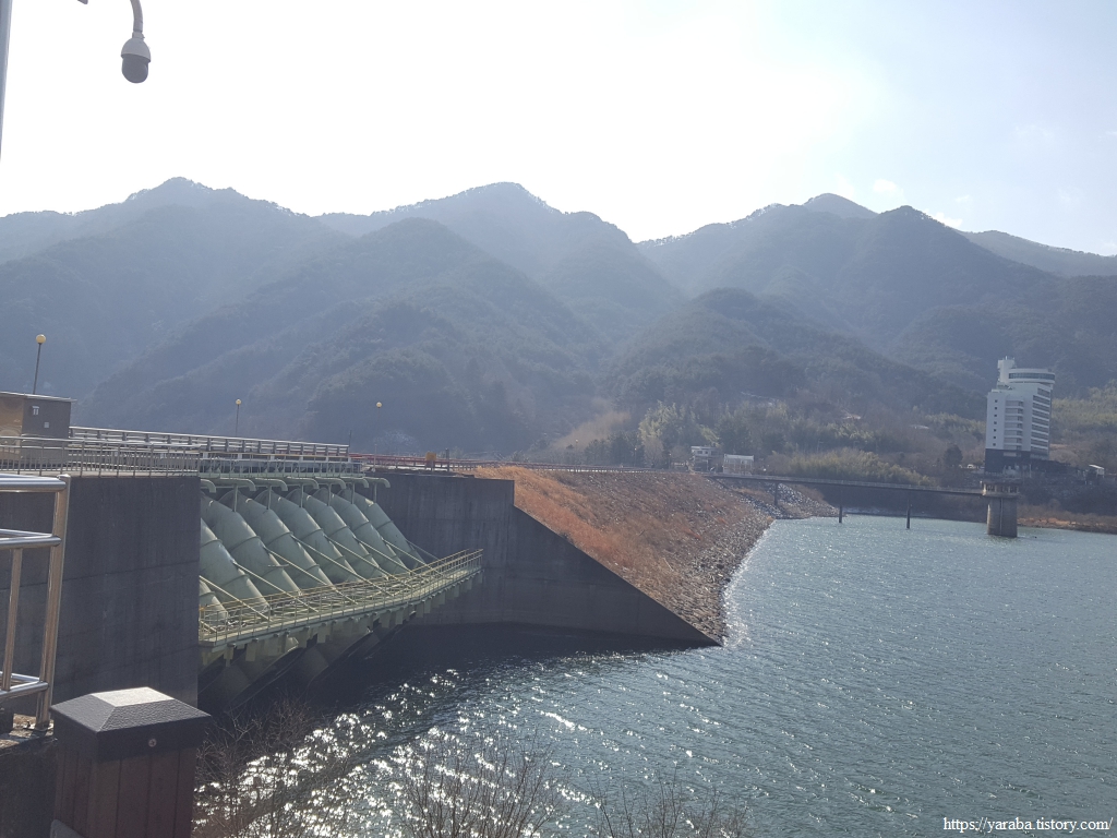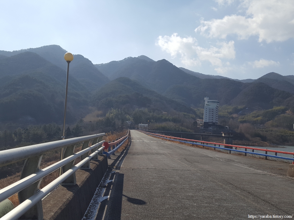 길은 어느덧 사이펀 여수로가 설치된 댐에 도착했다. 하동호는 경남 최대 규모의 농업용 저수지라고 하는데 사이펀 여수로는 저수지의 수위가 일정 높이 이상이 되면 저수지의 물이 동력 없이 하류로 자동 배수되도록 하는 장치라고 한다. 댐의 안정성을 확보하는 시설이라 할 수 있겠다.
