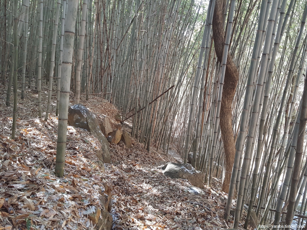 대나무 숲길을 자세히 보니 대나무들은 사람들이 살았던 주거지에 자리를 잡은 모양이다. 주거지를 만들었던 돌담이 선명하다. 누가, 언제까지 이곳에 살았을까? 그들의 삶은 과연 어떤 모습이었을까? 집은 어떤 모양이었을까? 수많은 질문들만 남겨진다.