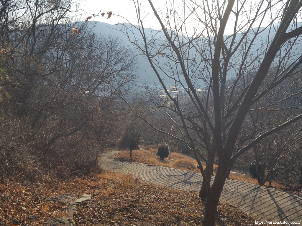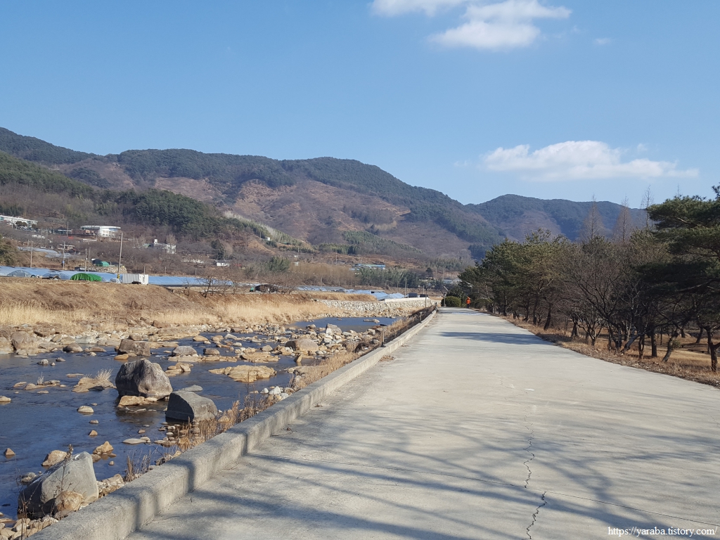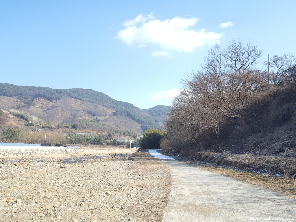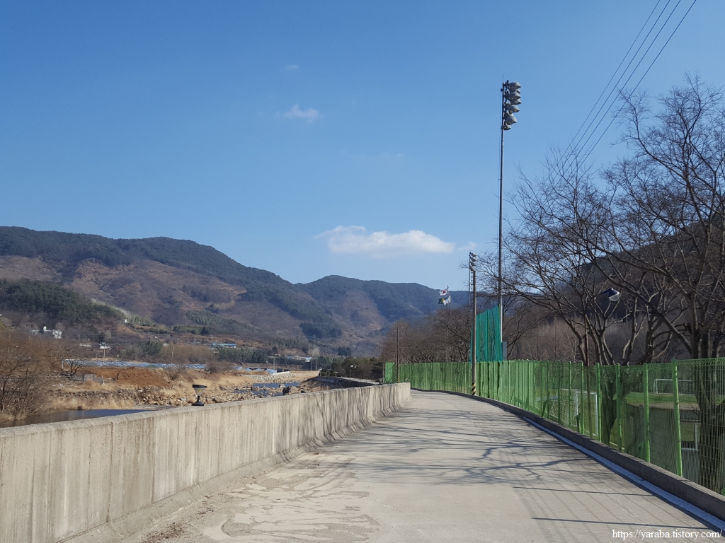 산책로 응달에는 새벽에 내린 눈이 남아 있고 강 건너편 방화고지 산 아래로는 언덕에 자리한 청암중학교와 묵계초등학교 청암분교도 시야에 들어온다.
