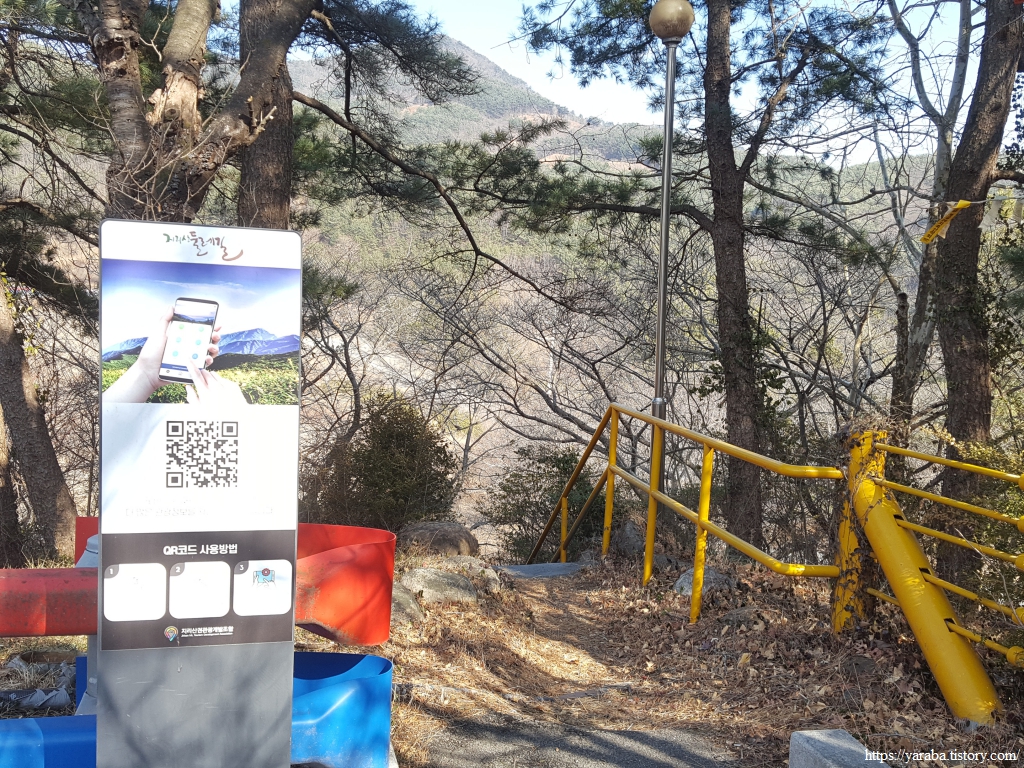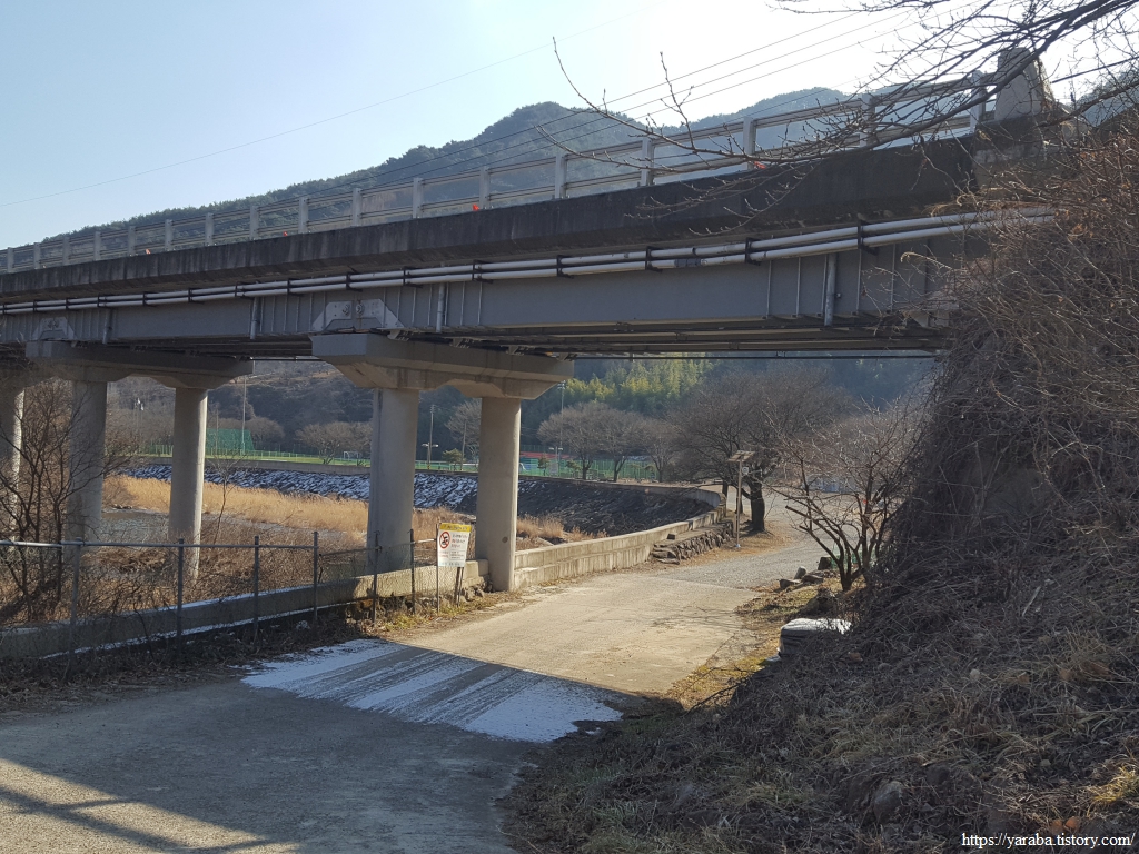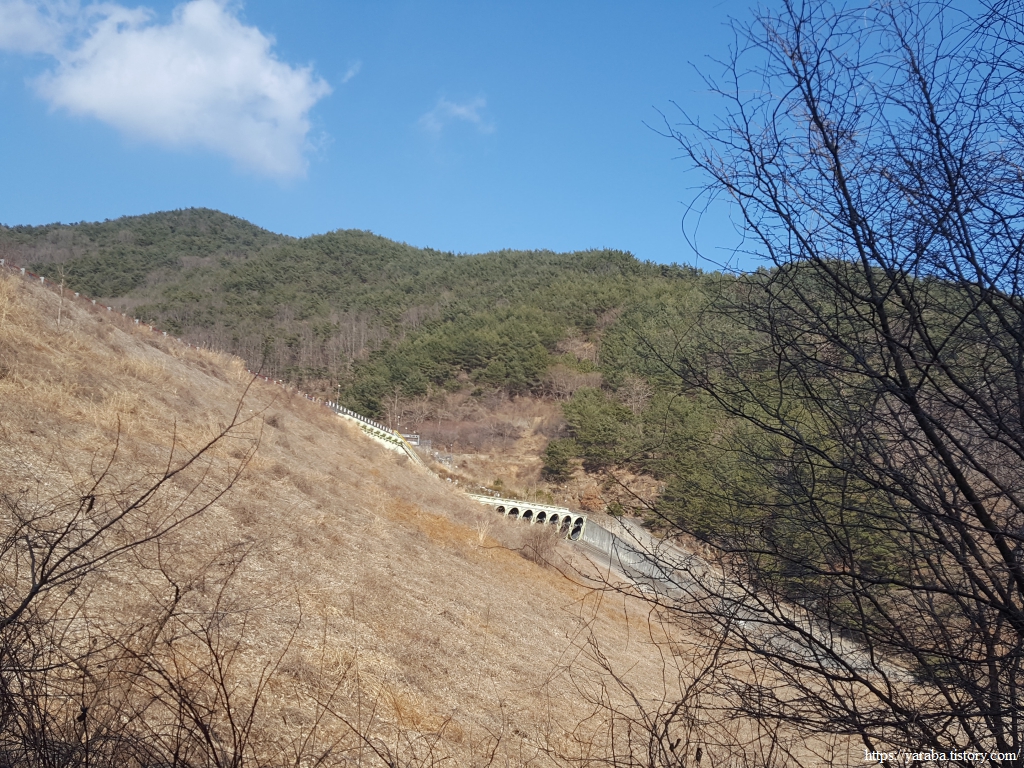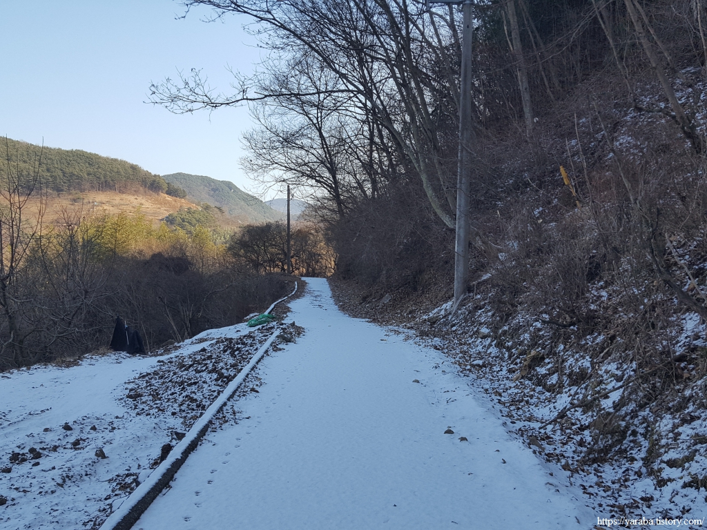 산책로 응달에는 새벽에 내린 눈이 남아 있고 강 건너편 방화고지 산 아래로는 언덕에 자리한 청암중학교와 묵계초등학교 청암분교도 시야에 들어온다.