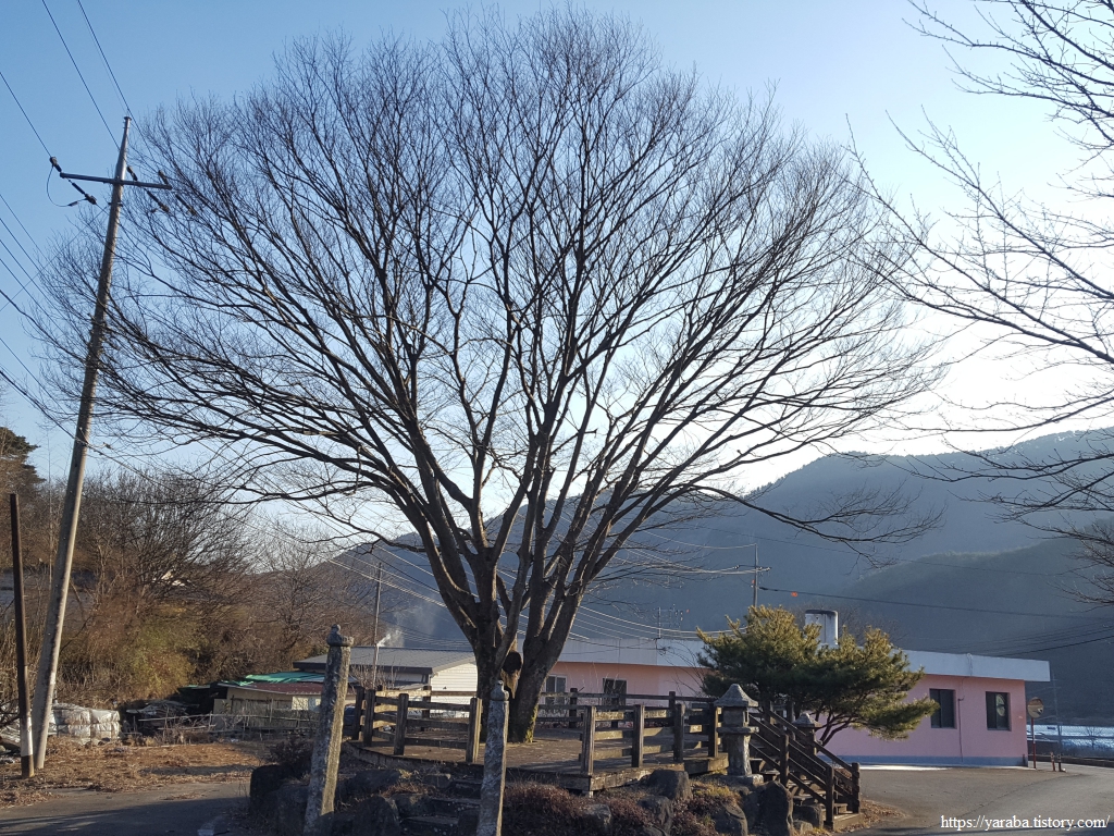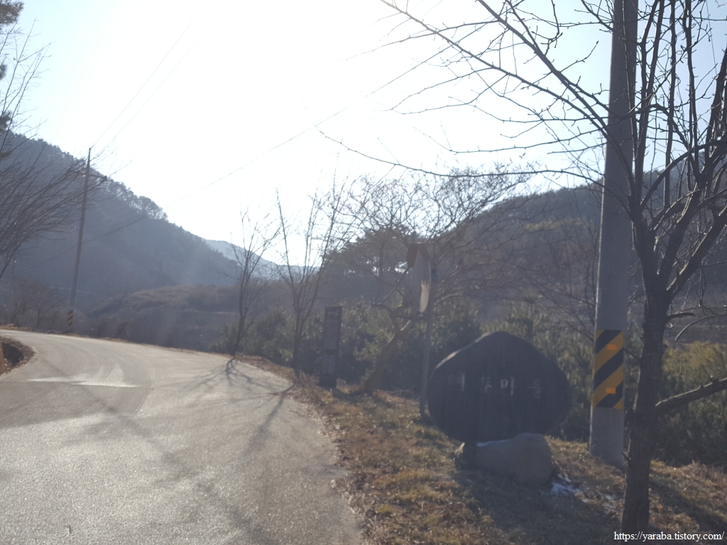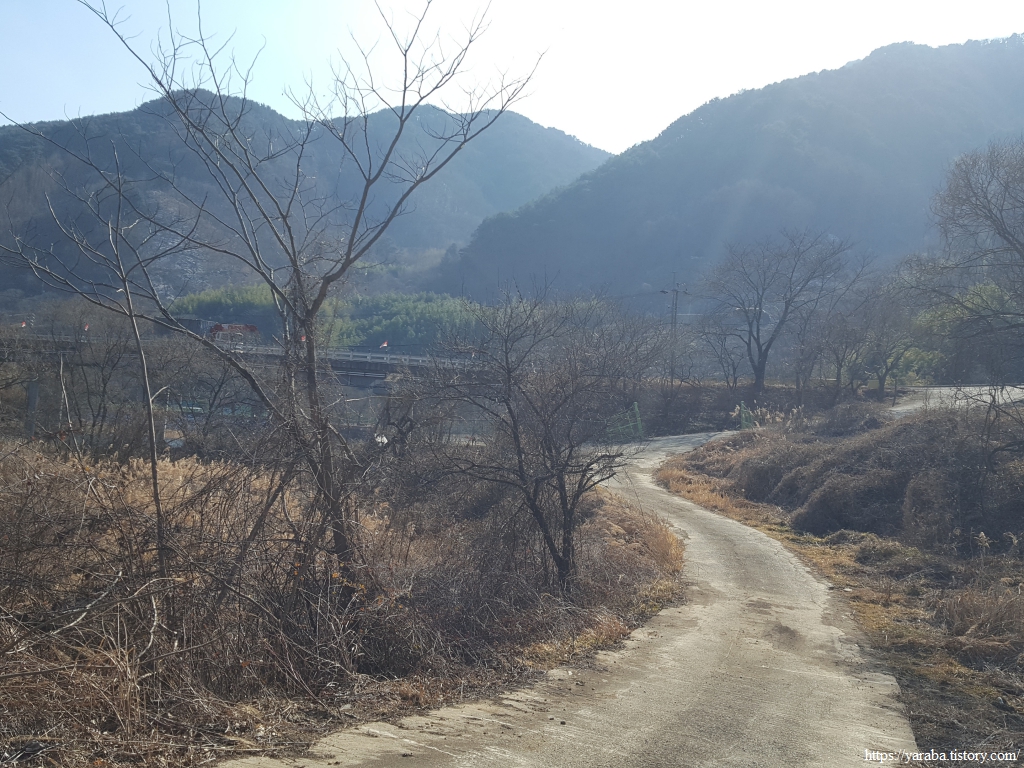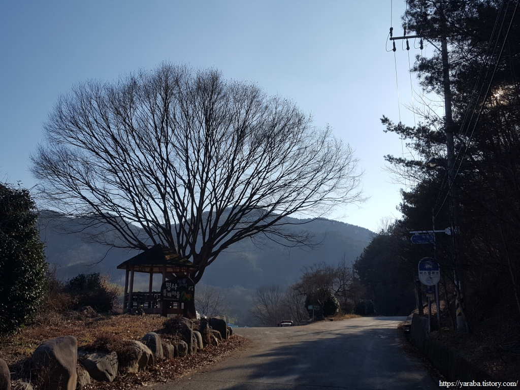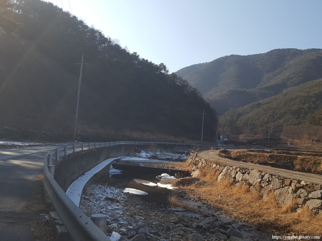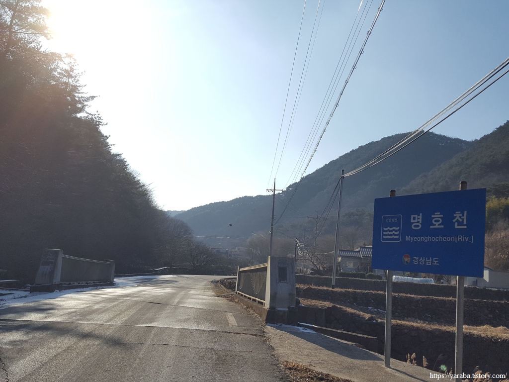명호천을 건너서 하천 우측에서 걷다 보면 커다란 나무가 인사하는 하존티 마을을 통과한다. 계곡 사이로 완만한 오르막길이 계속 이어진다.