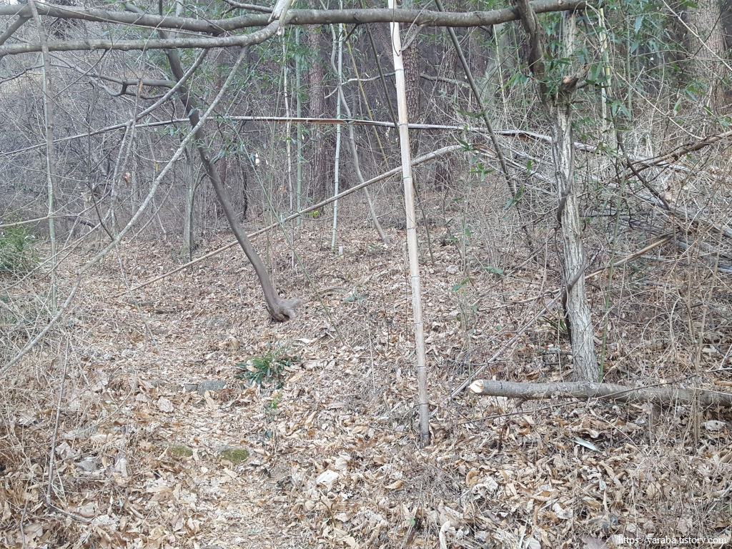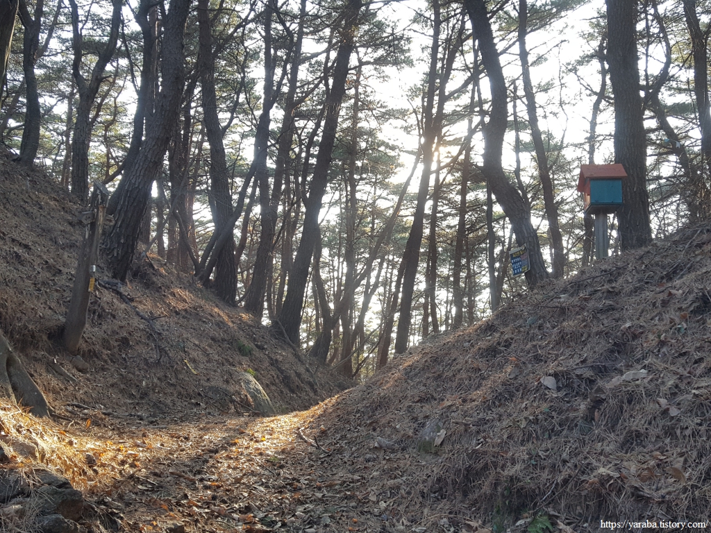 숲 사이로 따스한 겨울 햇살이 들어오는 존티재 고개를 넘어 본격적으로 하산길에 나선다. 종점인 삼화실까지 1.2Km 남았다.