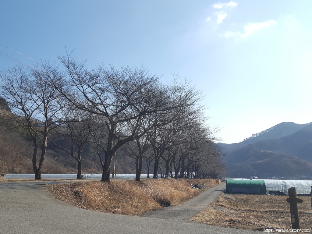 평촌마을은 하동군 청암면 면사무소가 있는 읍내에 해당한다. 남북으로 길게 뻗어 있는 청암면에는 우리가 다녀온 하동호와 함께 그 유명한 지리산 청학동을 풍고 있는 곳이다. 원래의 둘레길은 화월 마을 정류장 앞에서 우회전하여 강을 넘어갔다가 반월 마을 정류장으로 돌아오는데 우리는 그냥 도로를 따라 걷기로 했다. 봄이면 벚꽃으로 길이 아름답겠다는 생각을 하며 걷는다.