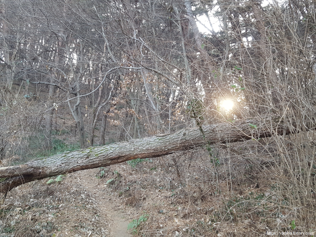 쓰러진 나무들이 뒤엉켜 원시림처럼 보이기도 한다. 오후의 태양이 서쪽 고개 너머로 힘을 내라고 우리를 응원한다.