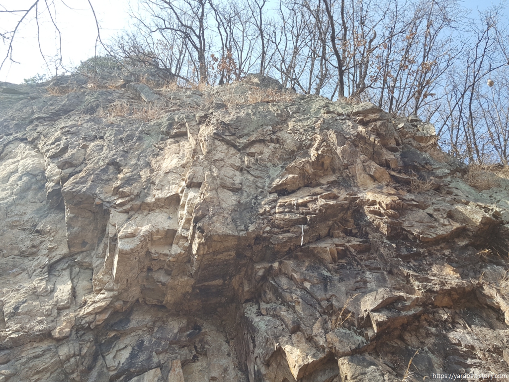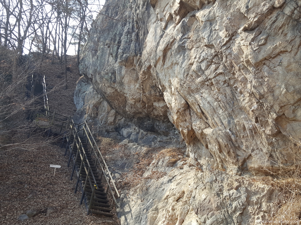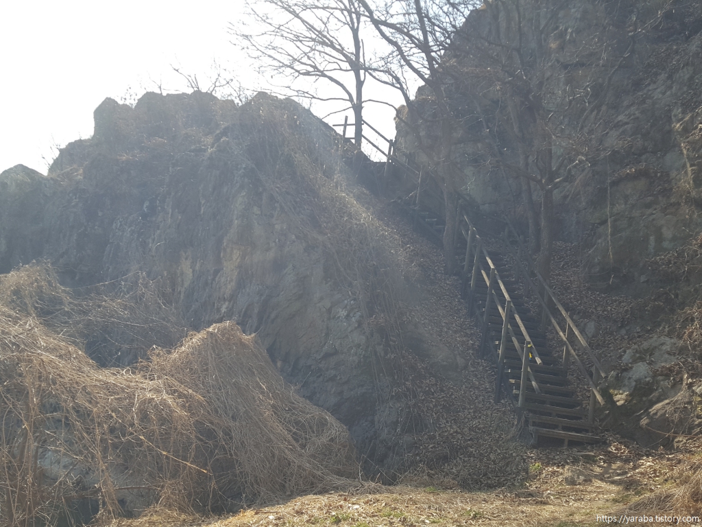 산책로에는 곳곳에 암벽 타기를 했던 흔적이 있었는데 이곳은 예솔암이라 부르는 암장이었다. 암장은 암벽등반, 클라이밍을 할 수 있는 바위 지대를 의미한다.