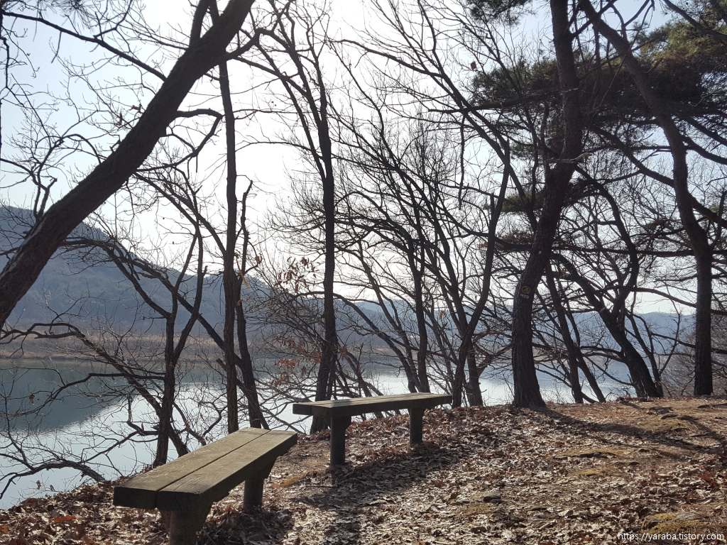 잔잔한 여강에 그려진 산 그림자가 일품이다. 시간이 넉넉하다면 아슬아슬한 벤치이지만 멍 때리기에 딱인 공간이다.