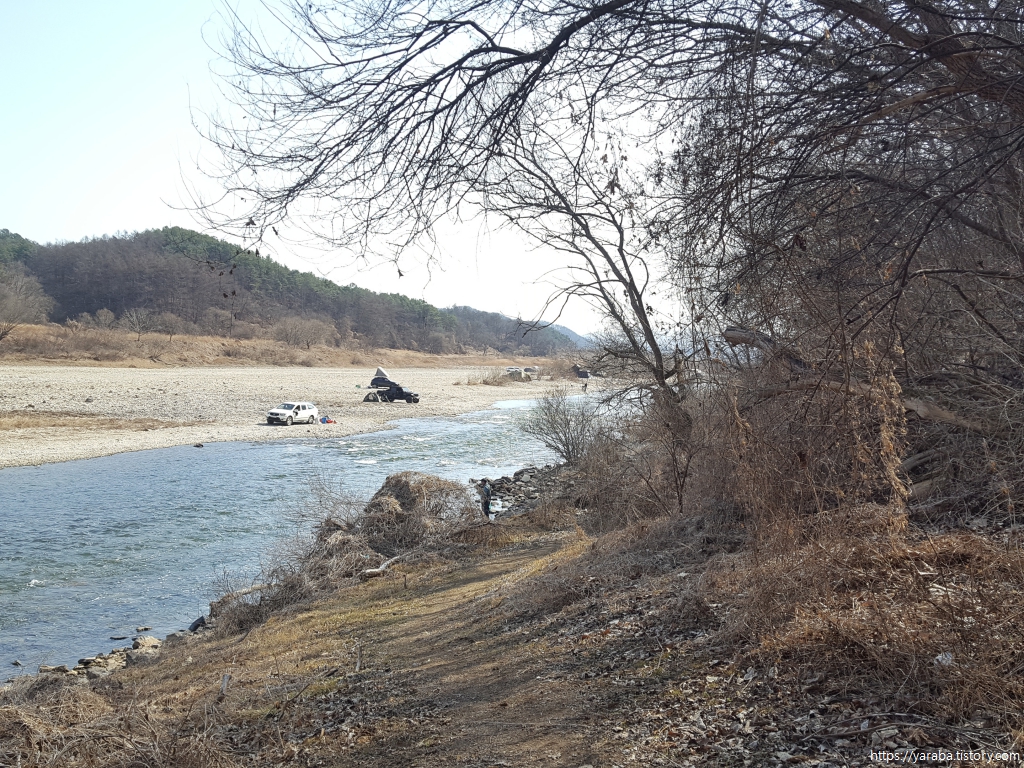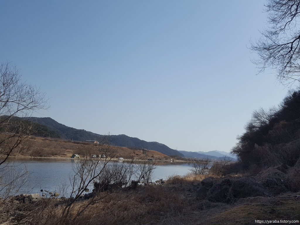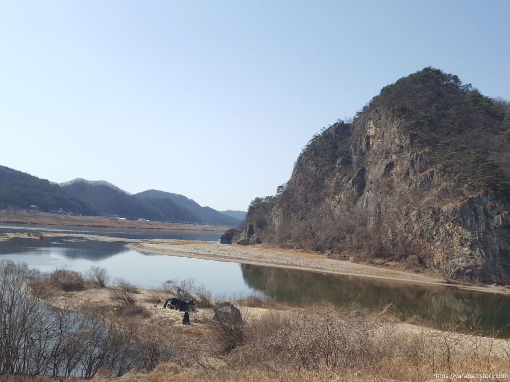 섬강교를 건너며 내려다본 섬강의 풍경은 자동차를 몰고 와 캠핑하는 사람들 차지다. 자산을 병풍처럼 두르고 바로 앞으로 섬강을 두고 있으니 최고의 노지 캠핑장이 아닌가 싶다.