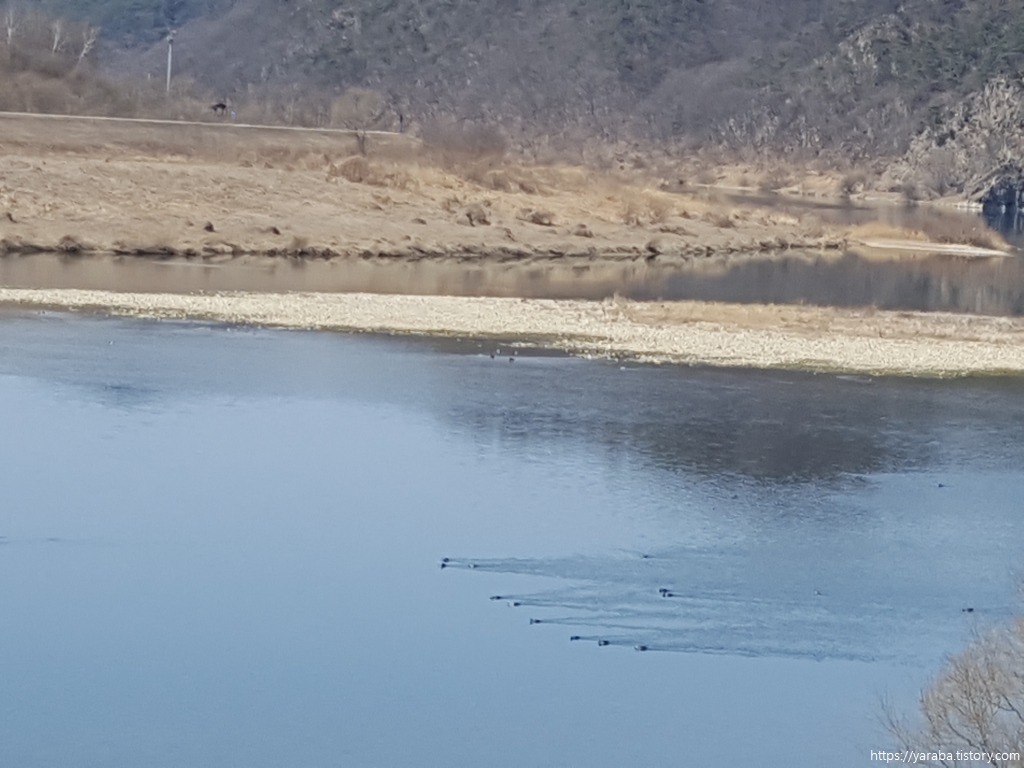 유유히 흐르는 강물을 보면서 이동하는데 강물 위에 바위가 있는가 해서 자세히 보니 바위가 아니라 새가 만든 물줄기였다. 마치 황조롱이가 사냥할 때 하늘에서 정지 비행하는 것처럼 물새들이 한자리에 떠있으니 바위처럼 보인 모양이다. 물 흐름을 거슬러 한자리에 계속 있으려면 물속에서는 열심히 발을 움직이고 있을 것이다. 잔잔해 보이지만 강물의 흐름이 있음도 알 수 있다.