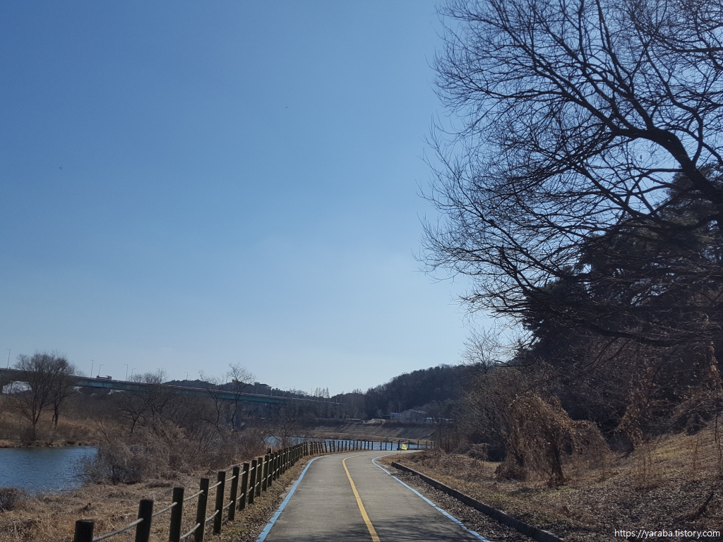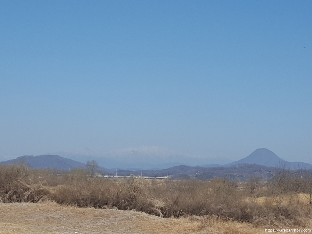 양화천을 건너가는 다리를 앞에서 북쪽의 원경을 바라보니 양평의 추읍산이 도드라져 보이기도 하지만 그 뒤로 멀리 하얀 눈이 쌓인 산봉우리들이 가는 겨울을 아쉬워하는 것 같다.
