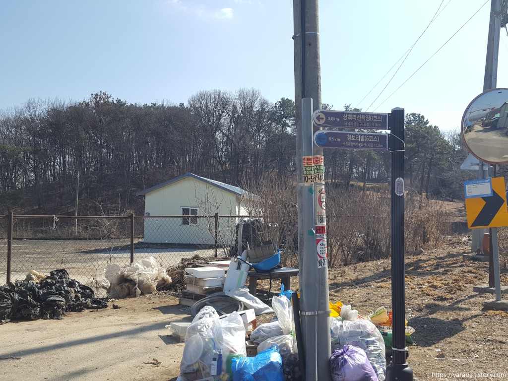 강변에서 상백 2리 마을회관으로 나오면서 7코스를 끝냈다면 6코스는 왔던 길로 다시 강변으로 나가는 방식으로 여정을 시작한다. 마음 초입 갈림길에서 우측길로 이동하여 강변길로 나간다.
