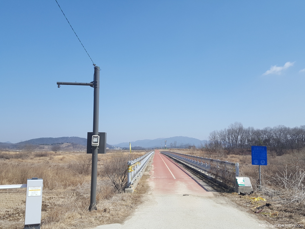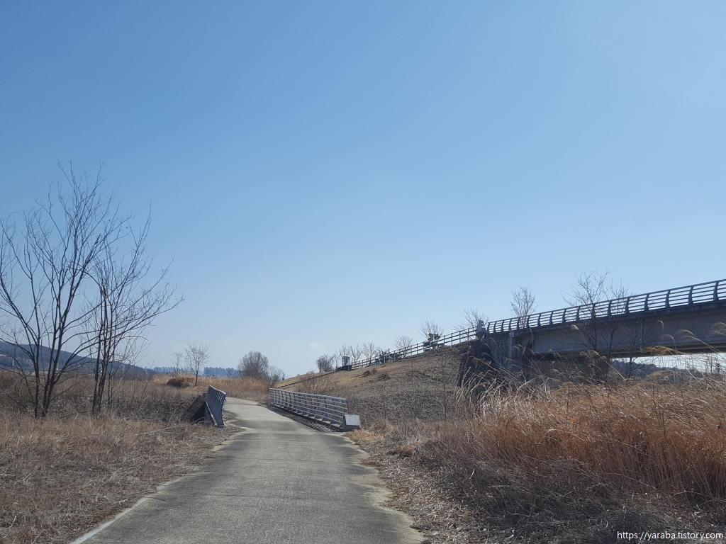 산림욕장을 내려온 길은 여주 시청 양궁장 앞을 지나서 효종교 다리 아래를 통과한다. 내일 4코스는 이곳에서 갈라져서 직진한다.