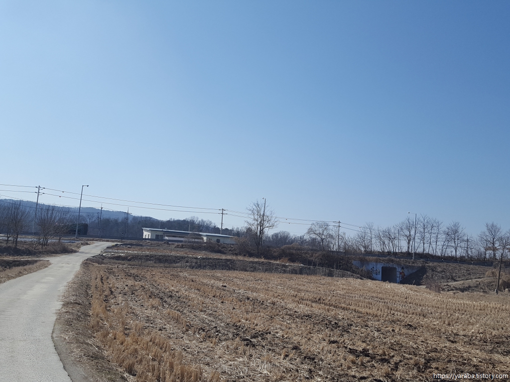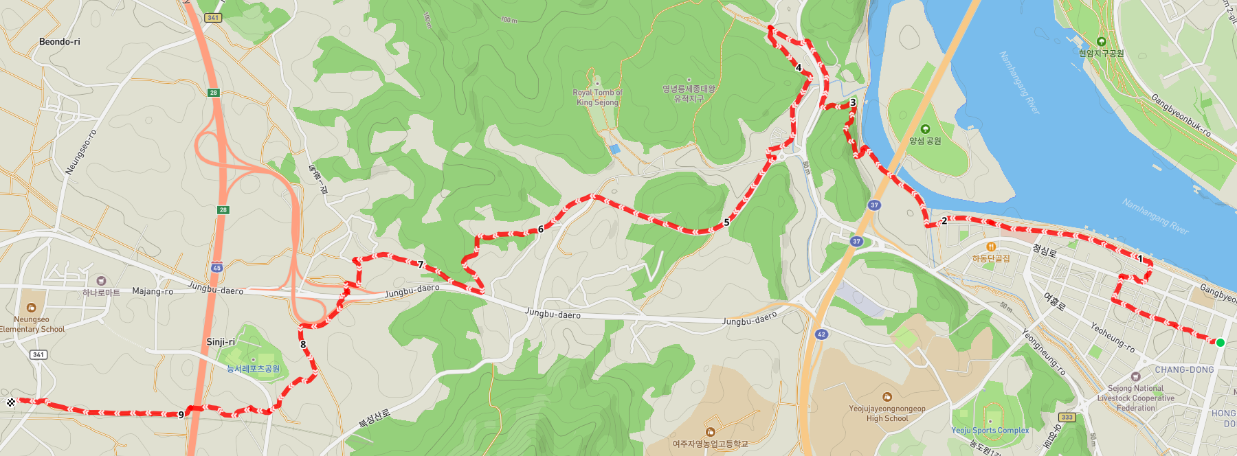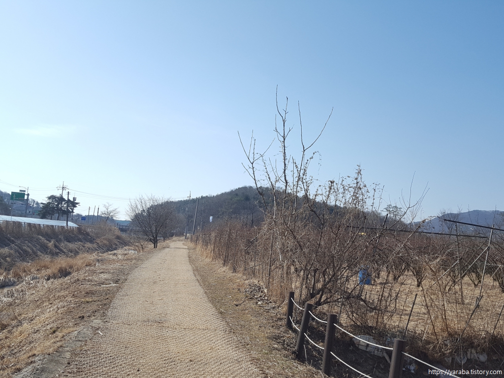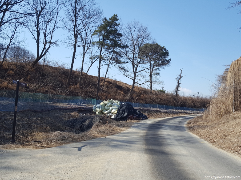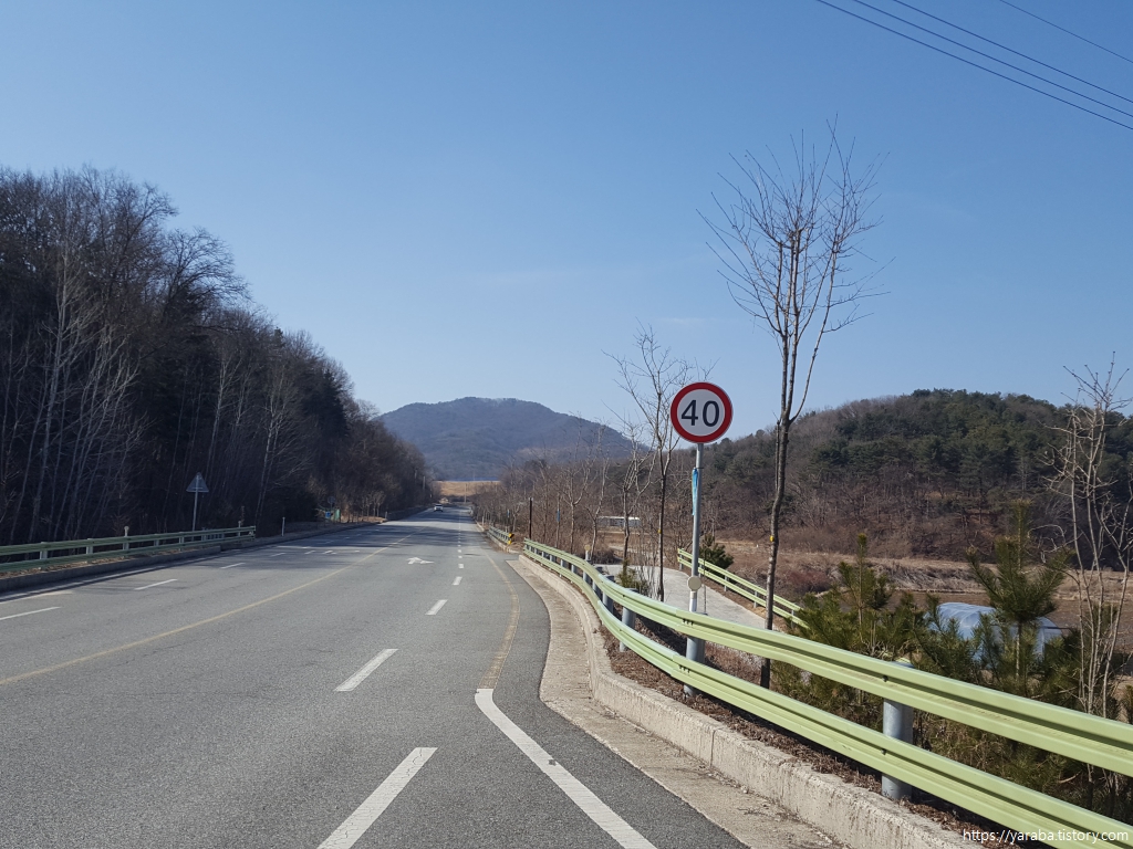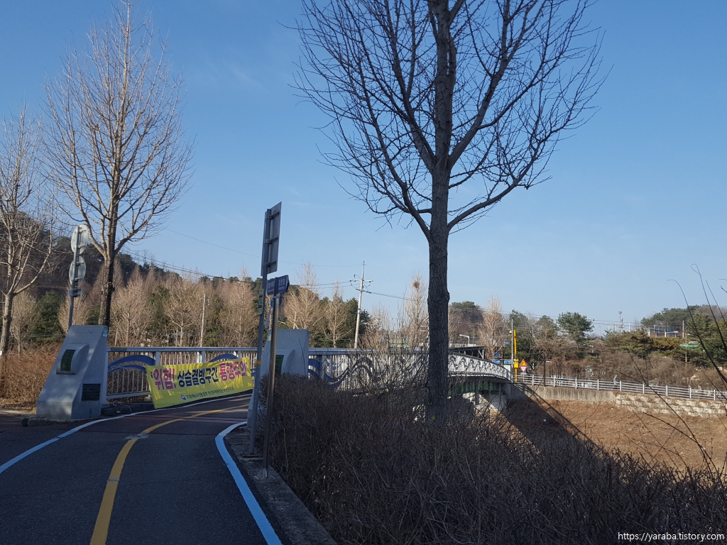 길은 어제 걸었던 여강길 6코스와 겹치는 구간을 걸어서 산을 내려가고 여주 시청 양궁장을 지나쳐 영릉로 도로를 따라서 직진한다. 어제 6코스는 이곳에서 좌회전하여 다리 아래를 통과했다.