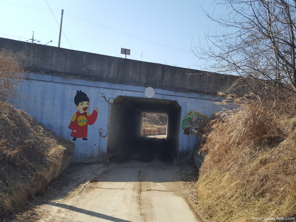 번도리를 벗어나는 여강길은 굴다리를 통해서 중부대로 아래를 통과한다. 굴다리 앞에서 아동스러운 모습의 세종대왕이 친절하게 길을 안내하고 있다.