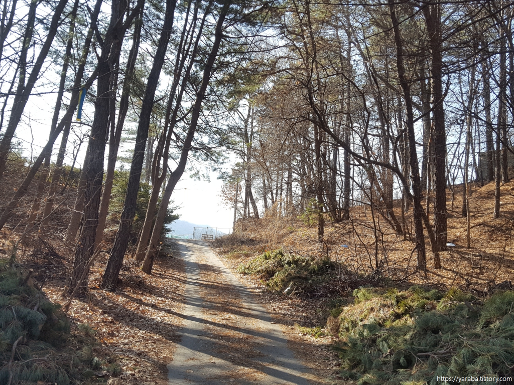 길을 남한강 자전거길을 뒤로하고 둑 위로 올라가서 세종 산림욕장으로 향한다.