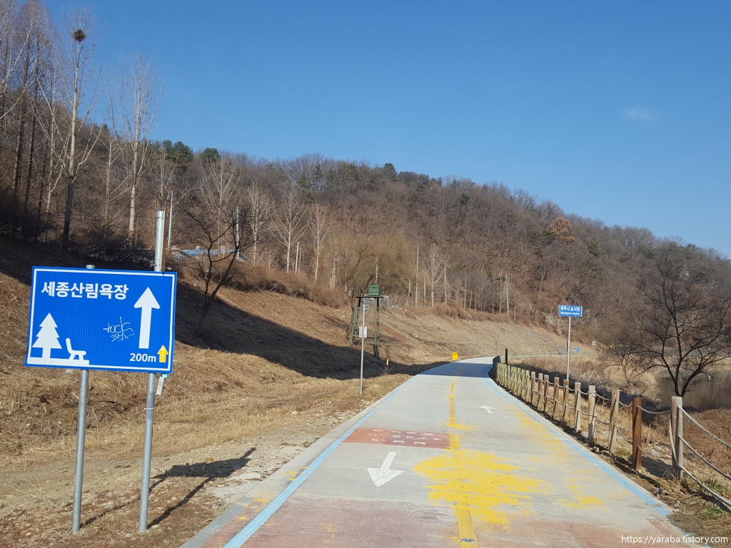 남한강 자전거길을 따라 이동하는 길, 우리가 가야 할 세종 산림욕장 표지가 등장했다. 어제도 받은 느낌이지만 수로 건너편으로 양섬을 두고 있는 이곳의 풍경은 아늑하면서도 아름답다.