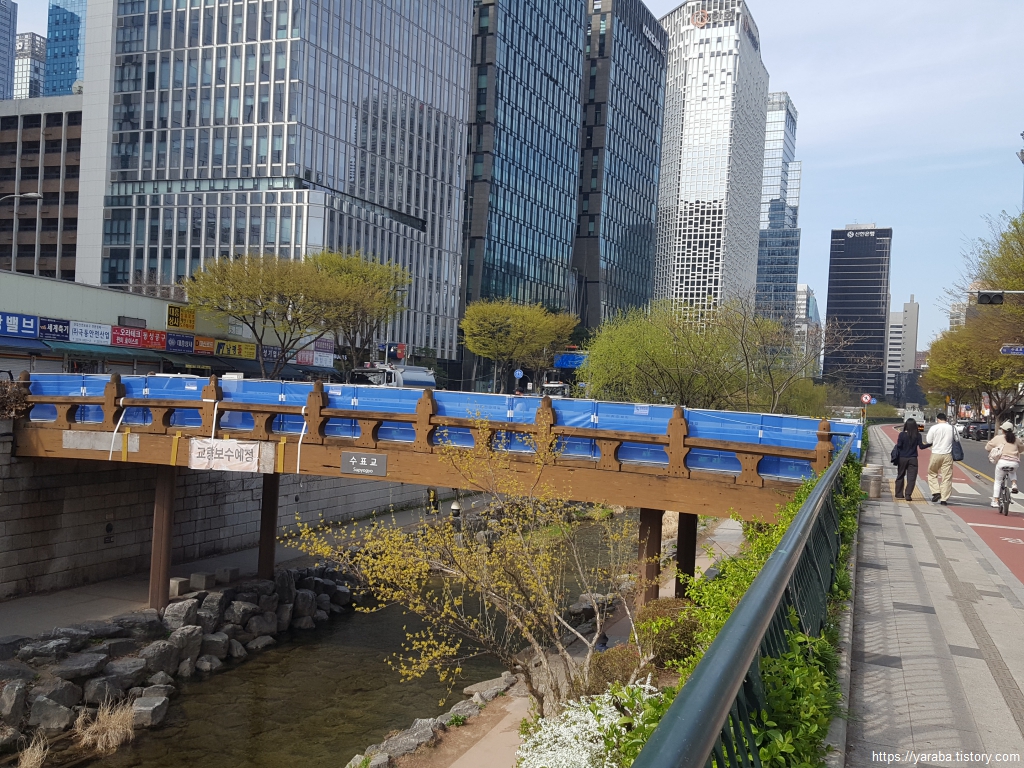 청계천을 건너온 길은 물길을 따라 수표교를 지난다. 청계천은 엄밀한 의미에서는 거대한 조경 공간이다. 한강물을 끌어올려서 정수한 물을 흘려보내고 있고 인근의 지하철에서 나오는 지하수를 흘려보내고 있다. 수표교는 홍수 관리를 위해서 수량을 재는 표식이 있던 다리라 수표교라 했다고 한다. 지금 있는 것은 임시 다리이고 청계천 복개 당시 원래의 다리는 장충단 공원으로 옮겨졌다. 장충단 공원에 있는 다리를 이곳으로 옮겨 오려했지만 폭이 맞지 않는다고 한다.
