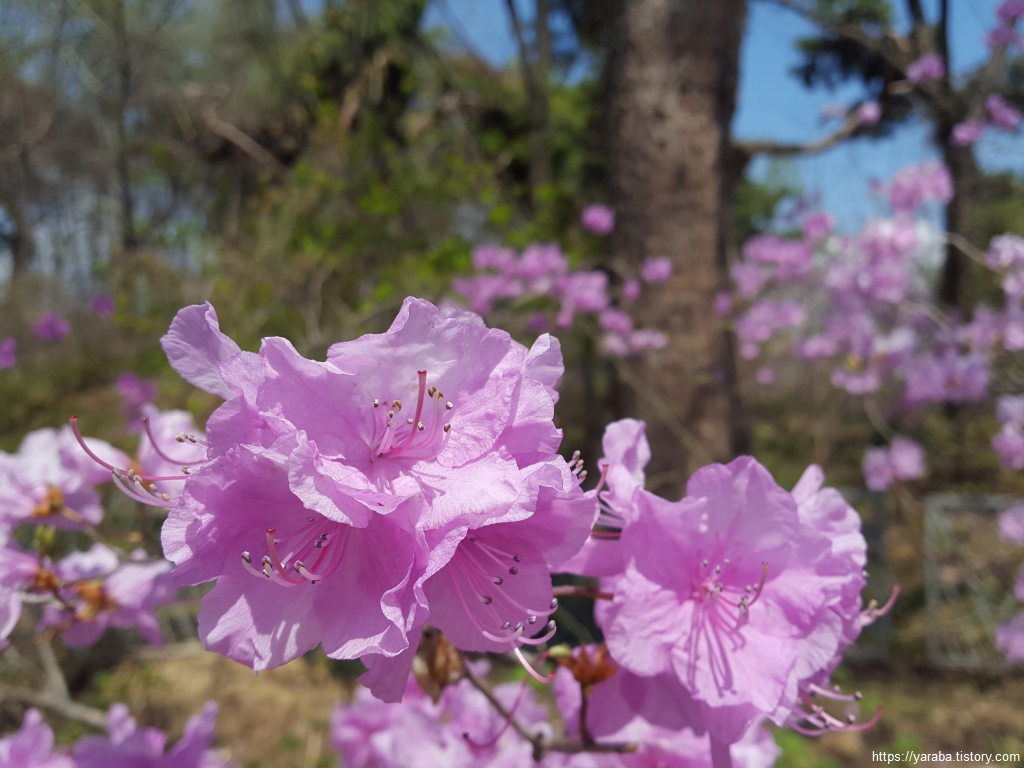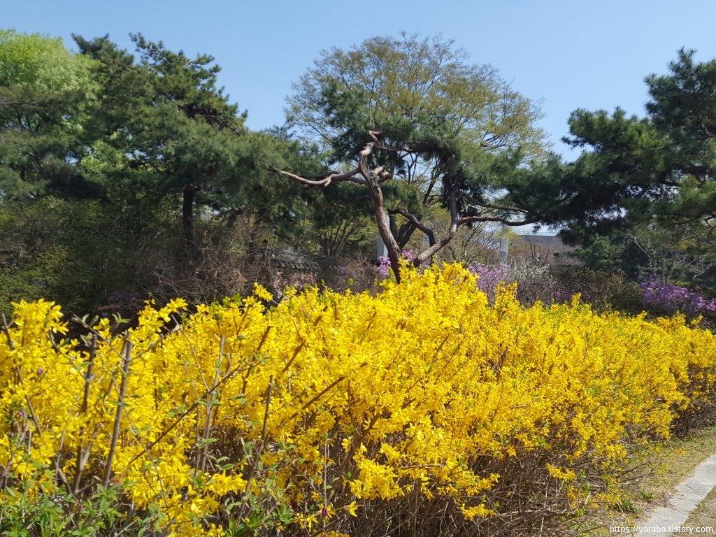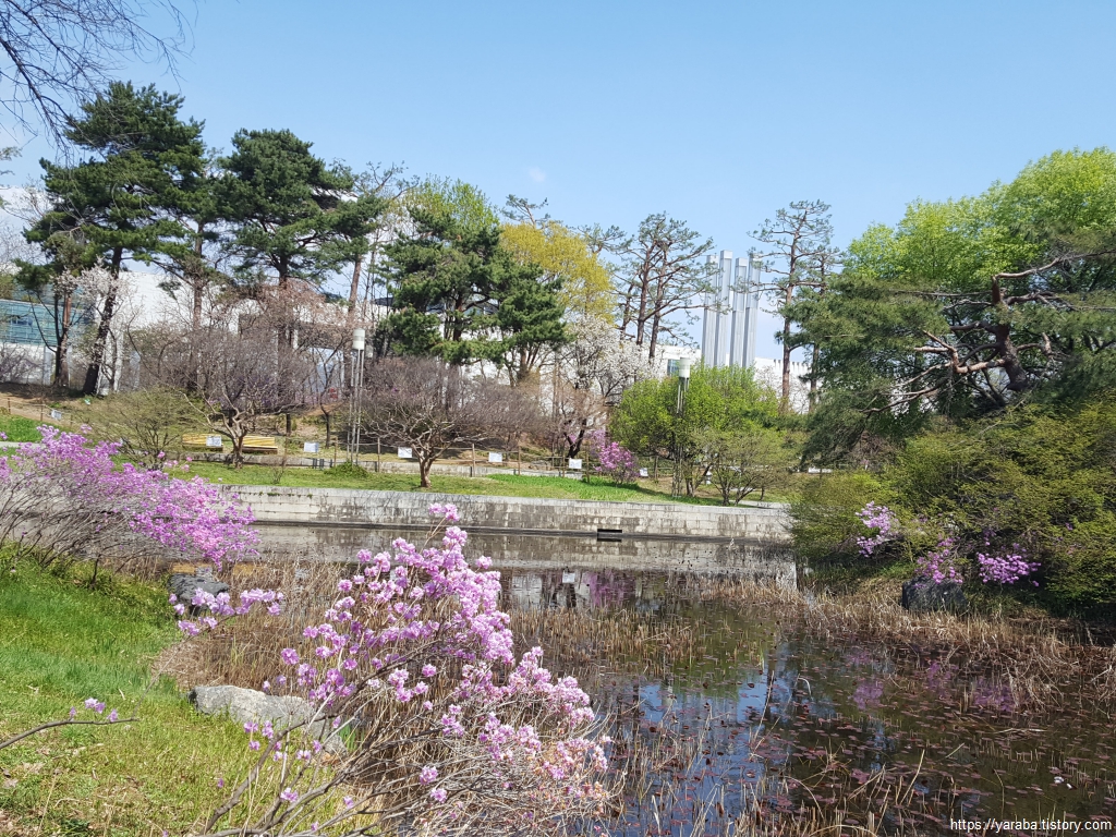 국립중앙박물관 앞의 벤치에서 넉넉한 휴식 시간을 가지고 출발하는 길은 따스한 봄 햇살을 받은 진달래가 화사한 색으로 자태를 뽐내고 있다. 산길에서나 볼법한 진달래를 정원에서 보는 것도 좋다. 참 곱다.