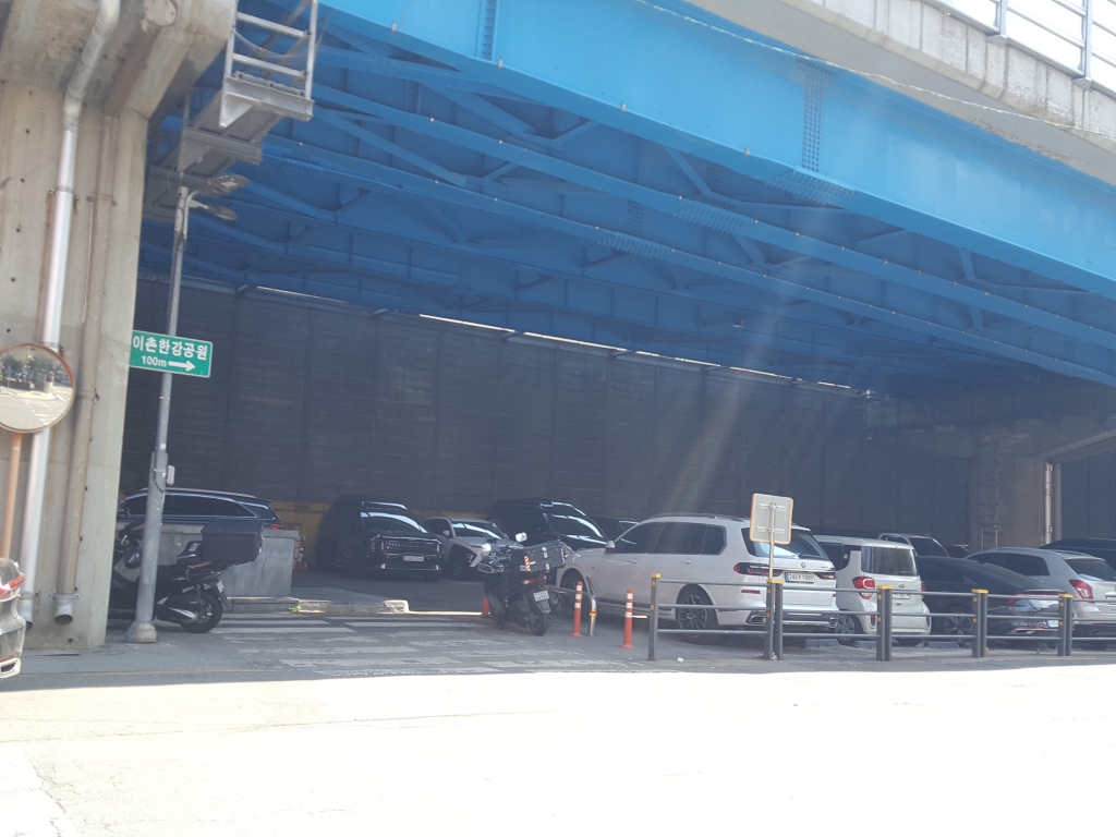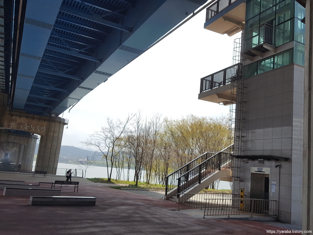 동작대교로 올라간 우리는 바로 강을 건너지 않고 한강 공원으로 내려가서 화장실도 다녀오고 휴식 시간을 가지며 간식도 챙겨 먹기로 했다. 엘리베이터를 타고 내려오면 다리 아래로 넓은 쉼터가 마련되어 있었다.
