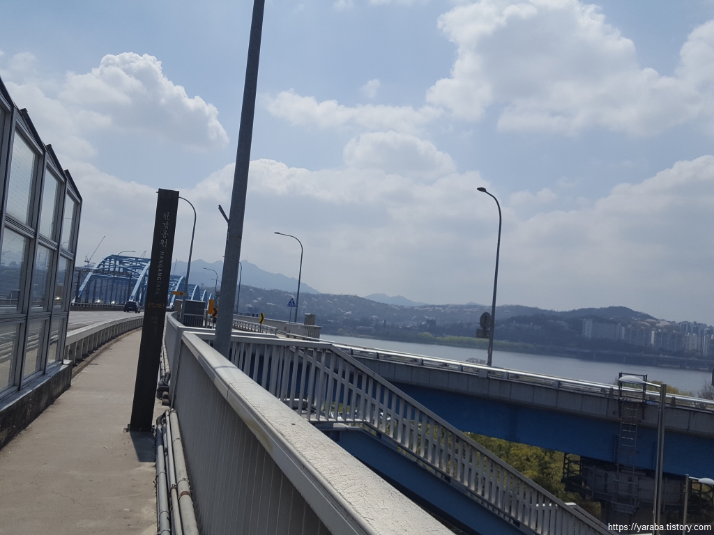 길은 용산 가족공원 육교에 동작대교로 바로 이어지지 않고 육교를 내려갔다가 이촌 한강 공원 방면으로 다시 올라가야 한다.