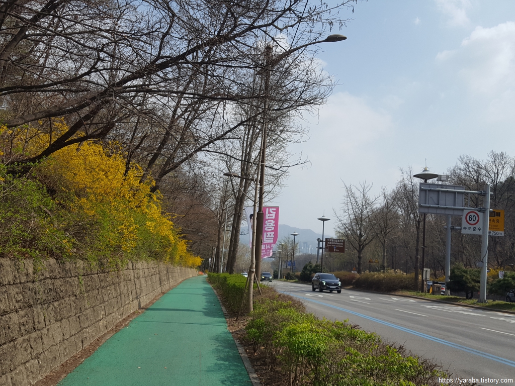 드디어 길 양쪽으로 해태상이 지키고 서있는 남태령 고개에 도착했다. 이제 길은 서울시에서 과천시로 넘어간다. 남태령 고개의 개나리를 보니 미아리 고개가 연상된다. 보통 고갯길은 산을 자르고 콘크리트 옹벽을 세우는 것이 보통인데, 개나리를 심으면 땅속 깊이 뿌리를 내리는 개나리 덕분에 경사지의 토사 유출을 방지하고 콘크리트 옹벽의 삭막함을 덜어주는 효과도 있어서 개나리를 많이들 심는다고 한다. 번식력도 좋으니 경사지에 개나리를 심는 것은 참 지혜로운 선택이지 않은가 싶다. 유일한 단점이라면 주기적으로 무성한 가지를 가지치기를 해주어야 한다는 정도라고 한다.