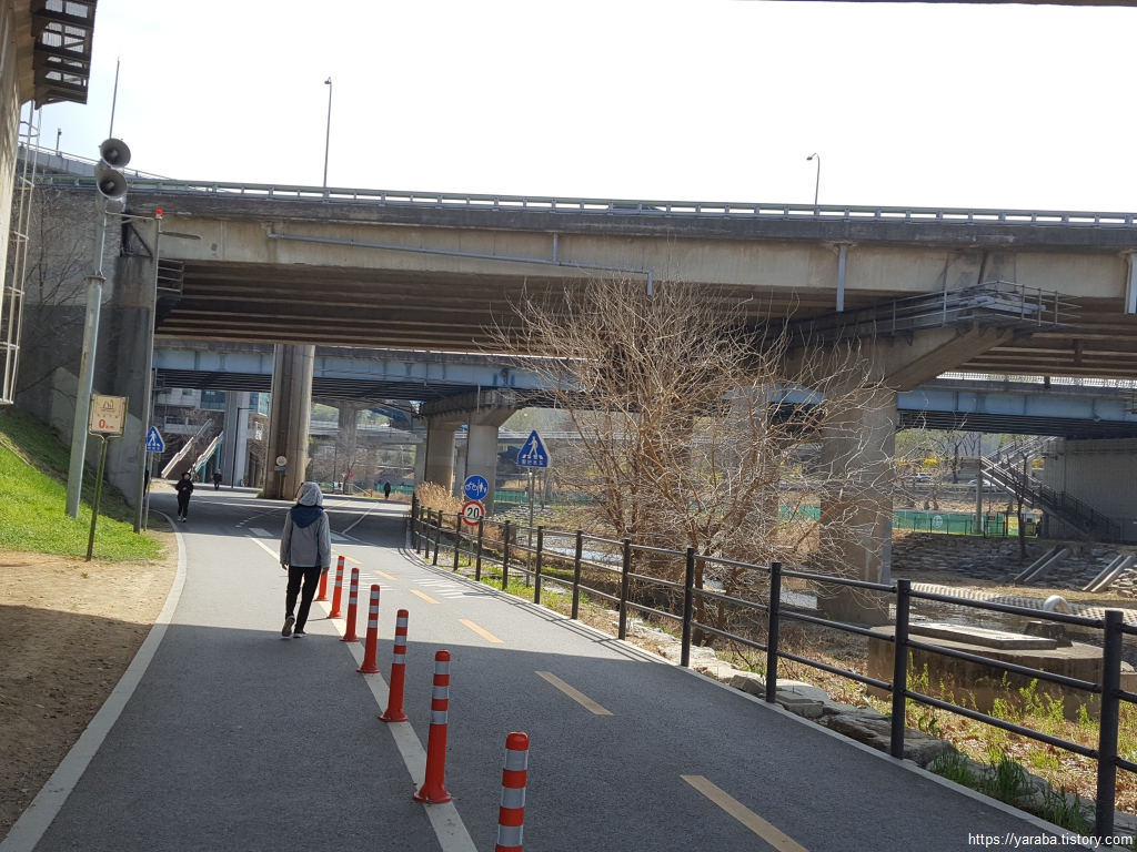 길은 동작대로 아래를 통과해서 동작역 1번 출구 방면으로 이동한다. 반포천을 따라가는 산책로에서 벗어나 둑 위로 올라가야 한다.